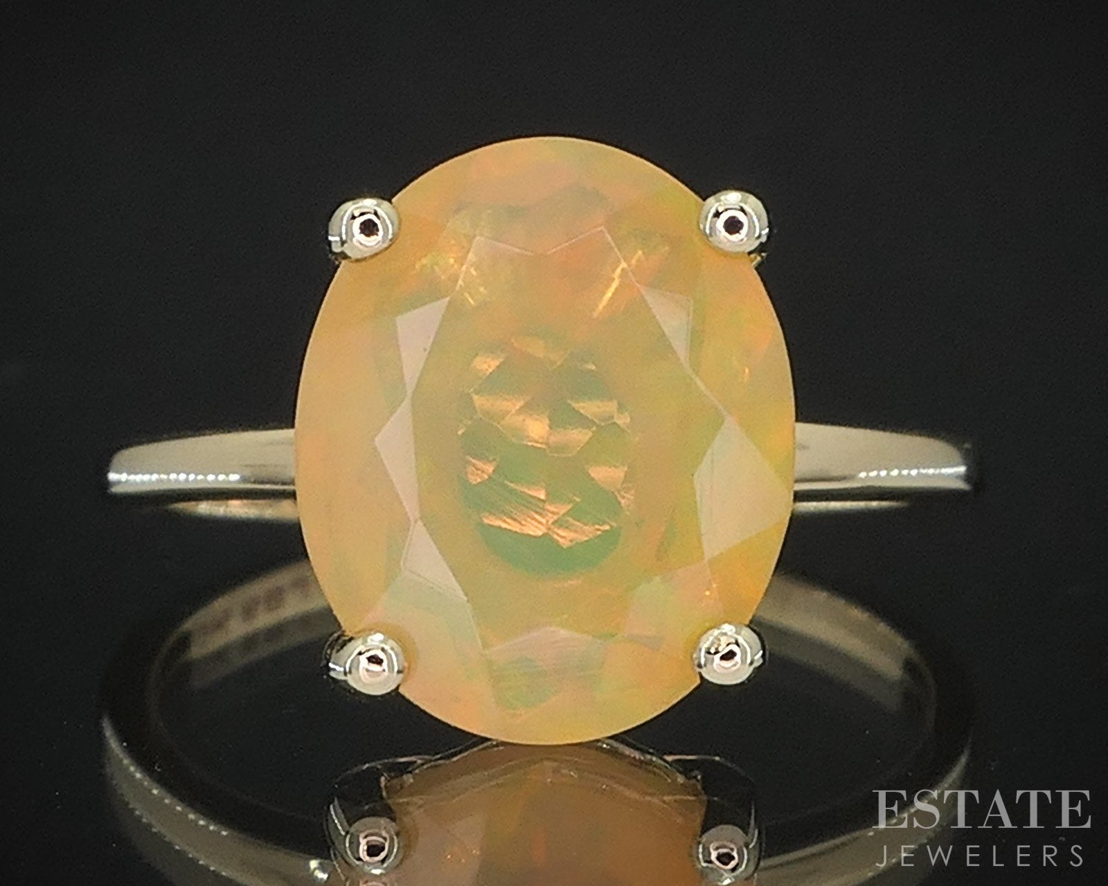 Additional Info: Lovely ladies ring with a colorful Opal gem in a solitaire setting. Beautiful green and red color flashes to the stone.