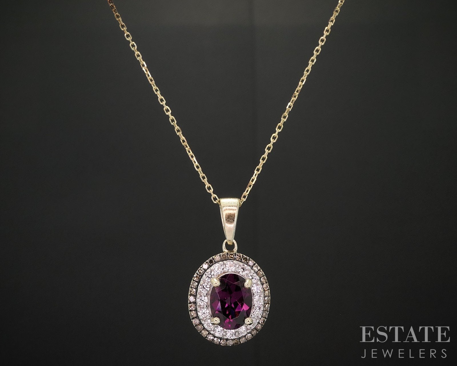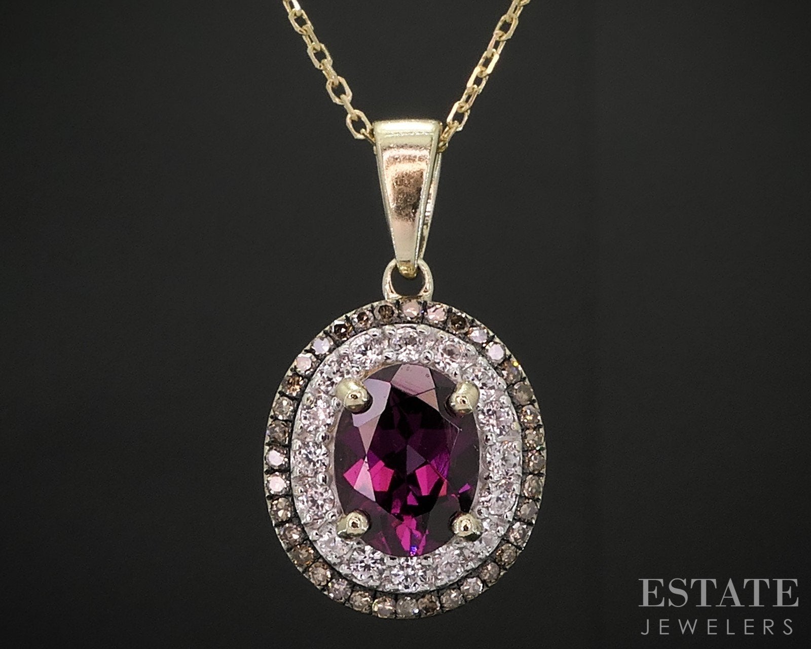 Additional Info: Lovely ladies necklace with a vivid Rhodolite Garnet accented by two colors of natural Diamonds! 14k cable chain attached to the 10k pendant.