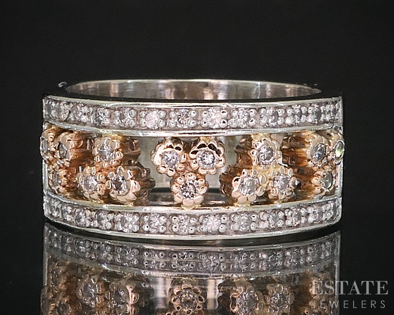 Additional Info: Lovely ladies open band with round cut Diamonds set throughout the front. Rose gold flowers set between white gold.