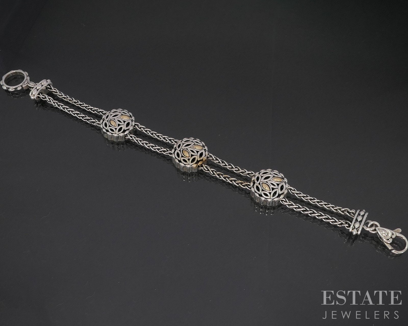 Additional Info: Genuine John Hardy two-row wheat chain bracelet with gold and sterling openwork circle panels.