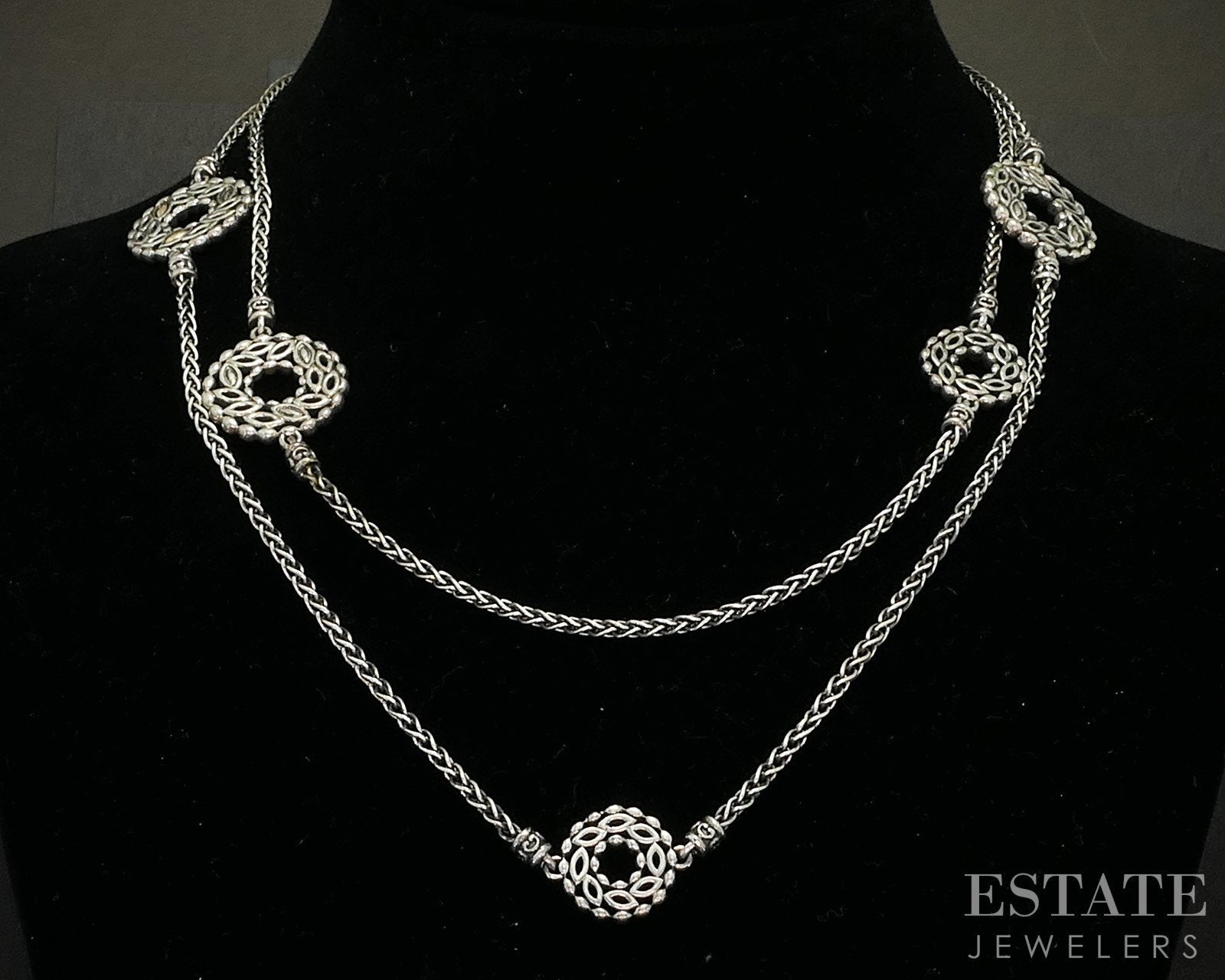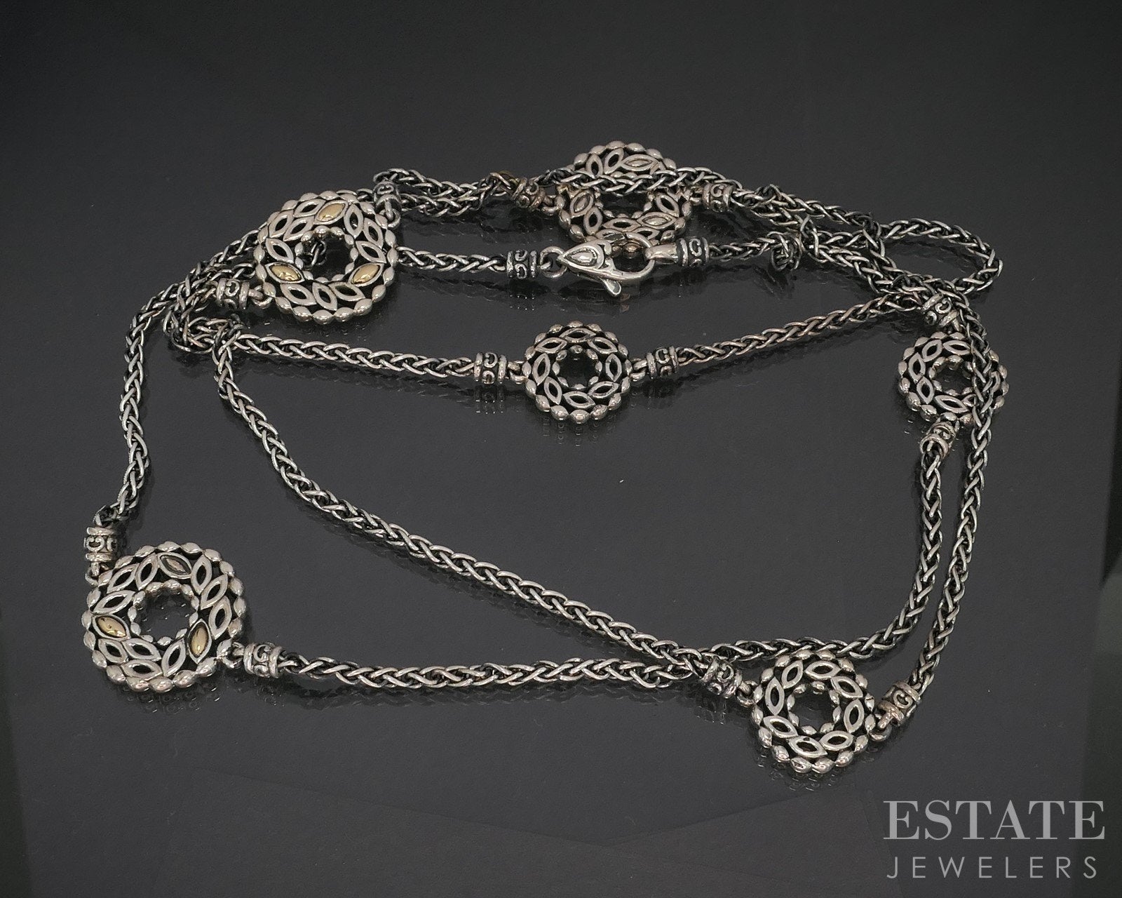 Additional Info: Genuine John Hardy wheat chain necklace with gold and sterling openwork circle panels throughout. Long enough to layer with any outfit!