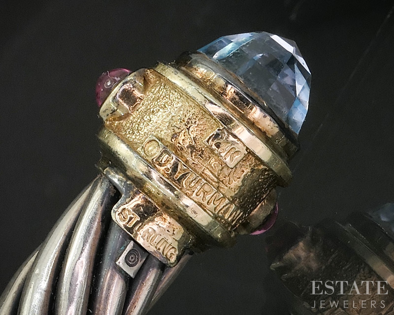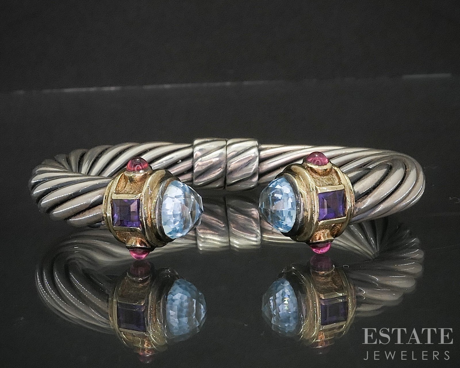 Additional Info: From David Yurman’s iconic Renaissance Collection, this cuff bracelet beautifully combines classic design with vibrant gemstones. Crafted in sterling silver with 14K yellow gold ends, the twisted cable form is instantly recognizable as a Yurman signature. At each terminal, richly colored Blue Topaz, Pink Tourmaline, and Amethyst gemstones are set in a striking arrangement, their brilliance enhanced by warm gold detailing. Bold yet versatile, this cuff embodies the artistry and elegance of Yurman’s celebrated aesthetic—an ideal statement piece for collectors and everyday luxury alike!