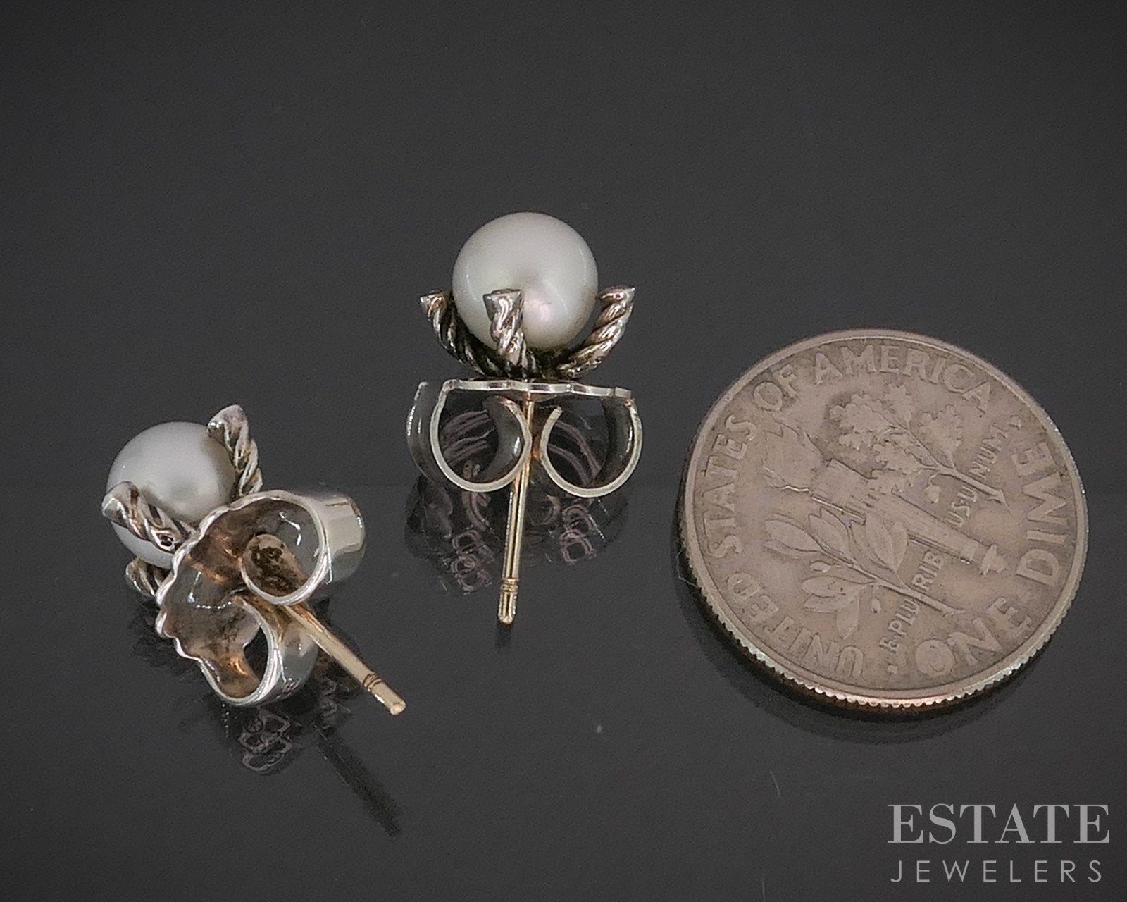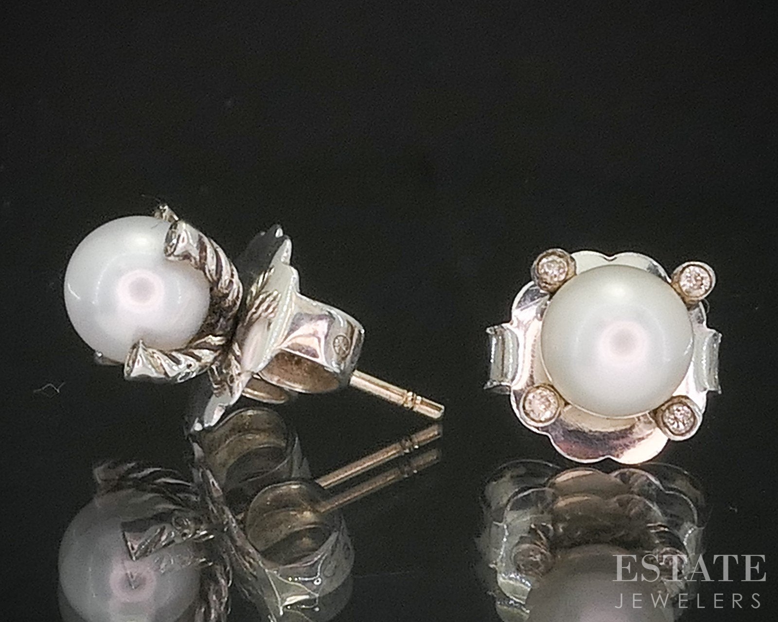 14k Sterling David Yurman Pearl & Diamond Cable Stud Earrings 2.3g p15359