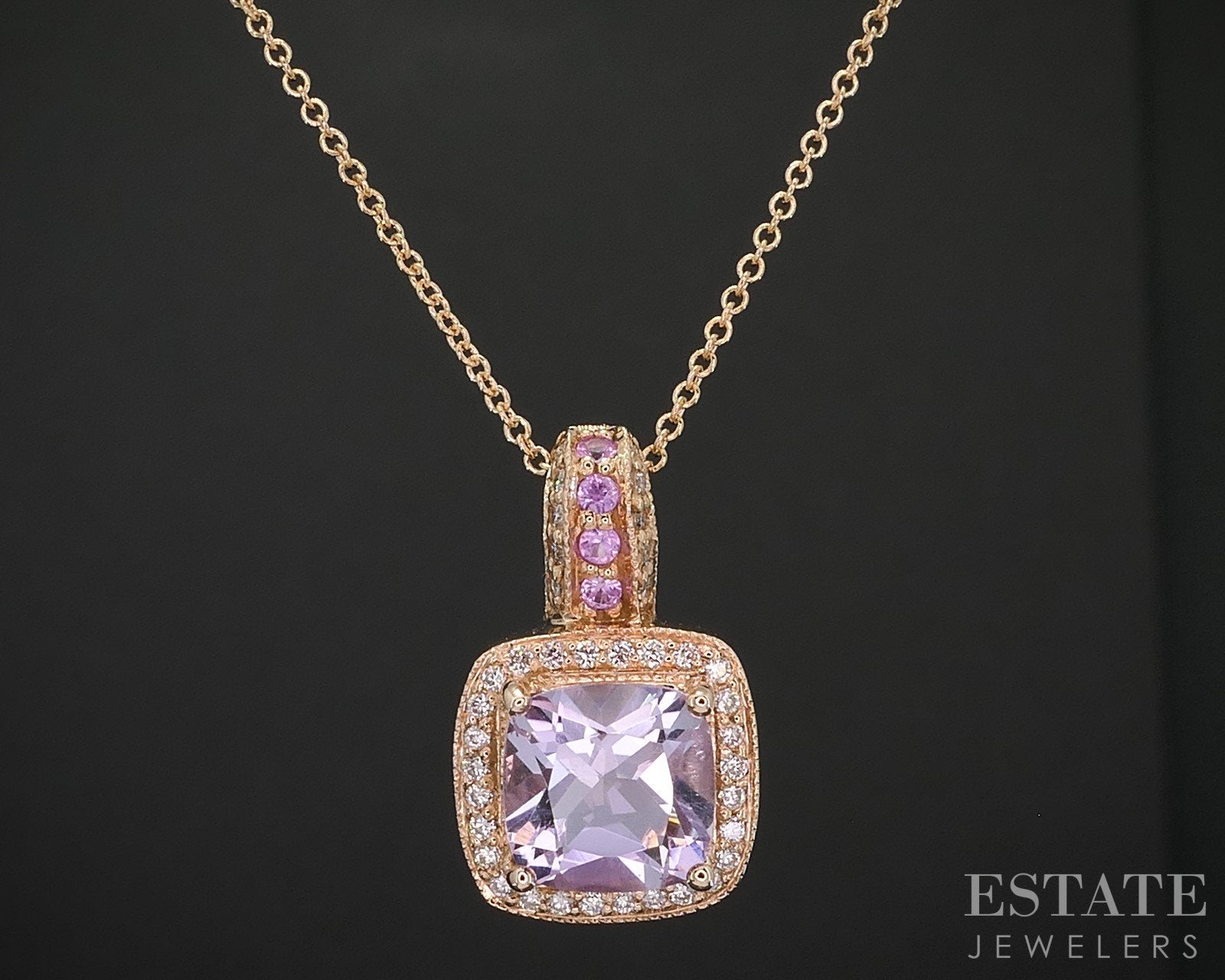 Additional Info: Radiating elegance and color, this LeVian necklace is a captivating blend of rich gemstones and signature design. Crafted in warm 14k Strawberry Gold, the pendant features a stunning, deep purple amethyst as its centerpiece, expertly faceted to catch the light. Surrounding the amethyst are sparkling white Diamonds and vibrant Pink Sapphires, creating a dazzling contrast of brilliance and color. Suspended from a delicate chain, this piece embodies LeVian’s iconic fusion of fashion-forward style and fine craftsmanship. Perfect for adding a bold yet feminine touch to any jewelry collection. Look for the matching earrings in our store!