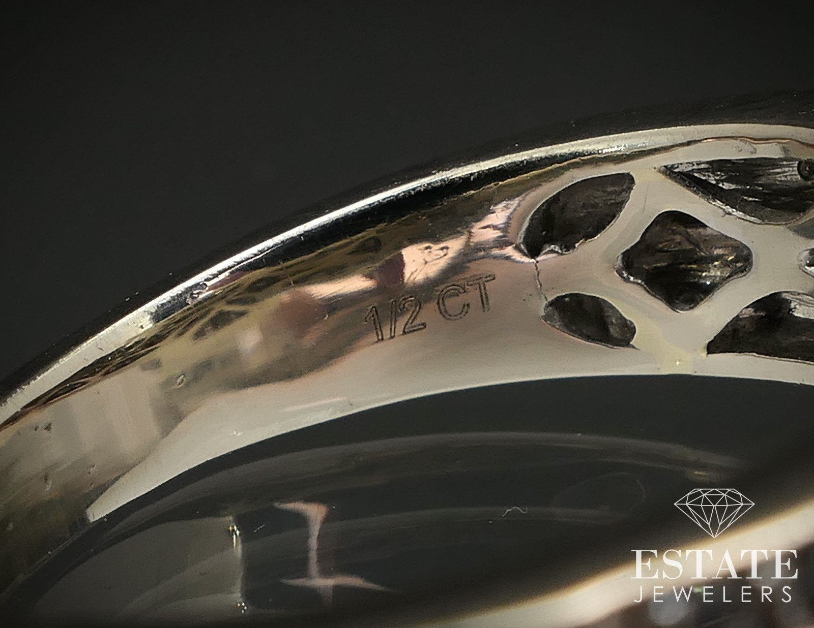 Sparkling engagement ring with approximately .50tw of invisible set and round cut diamonds on the white and yellow gold face. VS-SI clarity with HI color. 9mm tall face. stamped 14k 1/2 SIZE-5.75