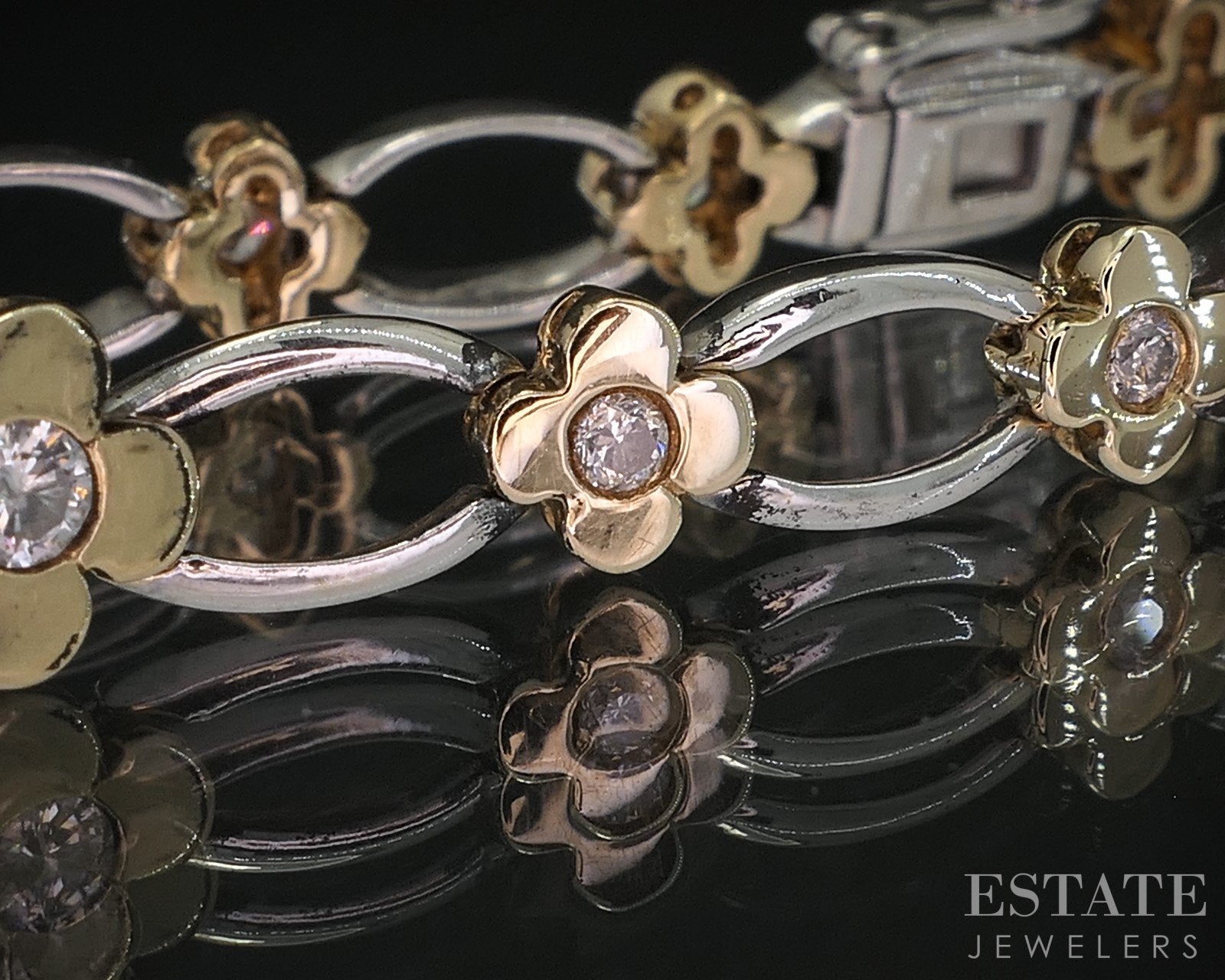 14k Two Tone Gold Natural .75ctw Diamond Flower Link Bracelet 11g 7.25"L i20046