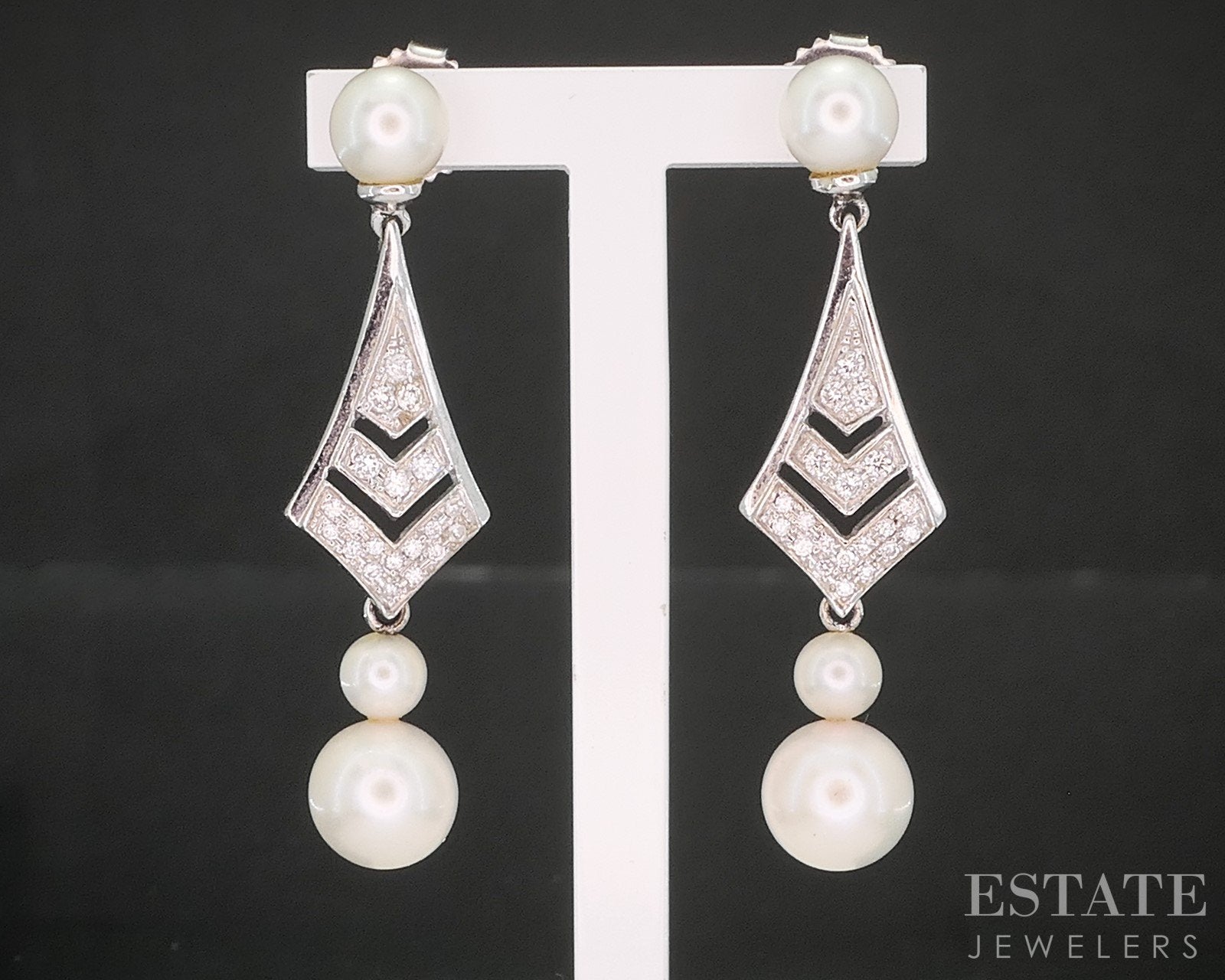 Additional Info: Lovely ladies Art Deco inspired earrings with a lustrous Akoya Pearls set on the bottom and top. Sparkling Diamond accents set in the middle.