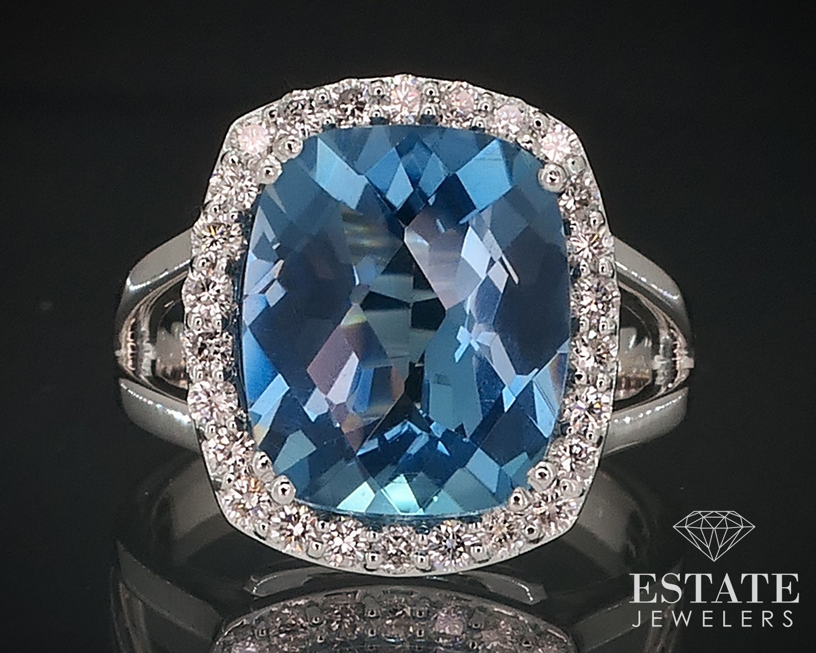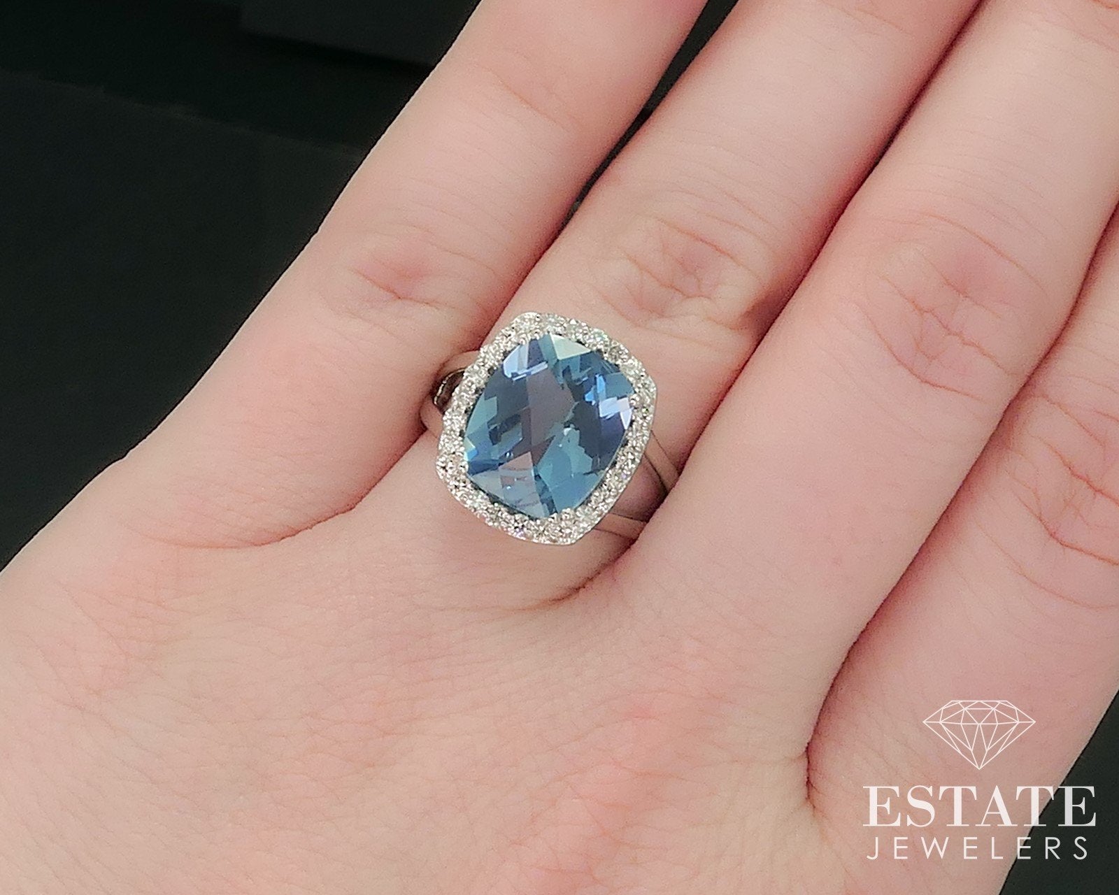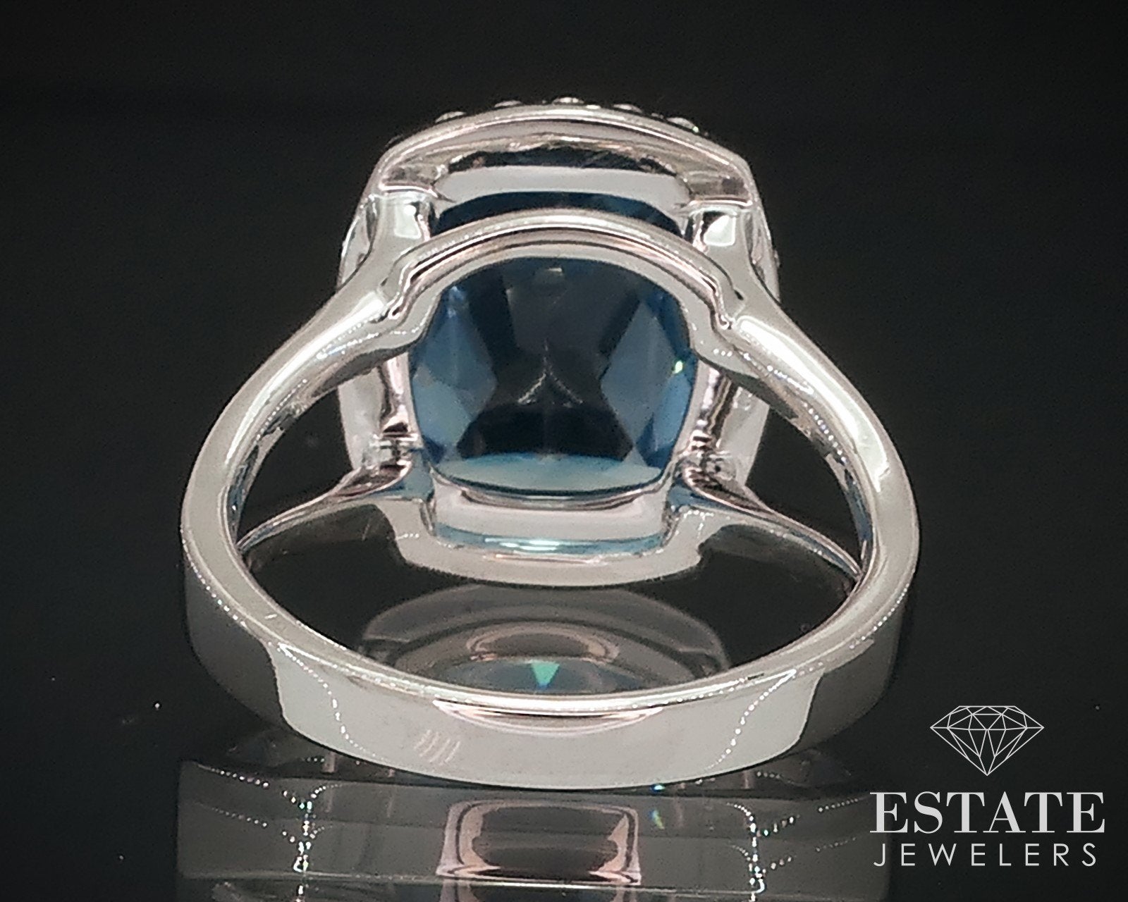 14k White Gold Cushion Natural Blue Topaz & Diamond Halo Ladies Ring 6.6g i17646