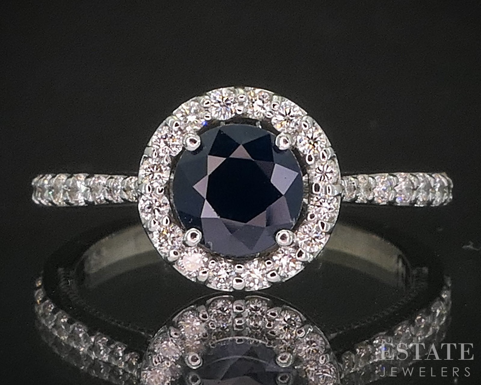 Additional Info: Beautiful ladies ring with a vivid Blue Sapphire and a halo of sparkling Diamonds.