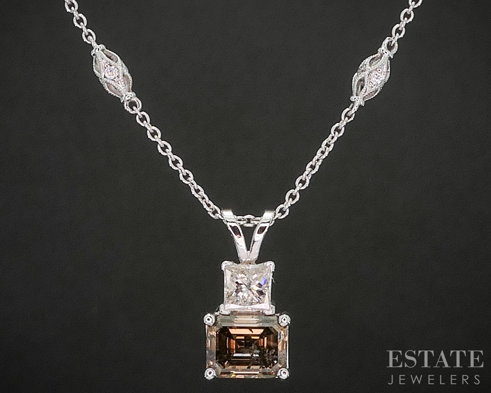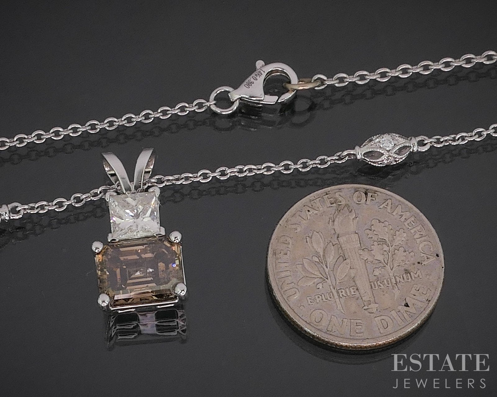 Diamond Information: Approximately 2.99ctw of Diamonds, including main 2.02ct emerald cut champagne Diamond, .58ct princess cut white Diamond and .39ctw of round Diamonds along the station necklace.