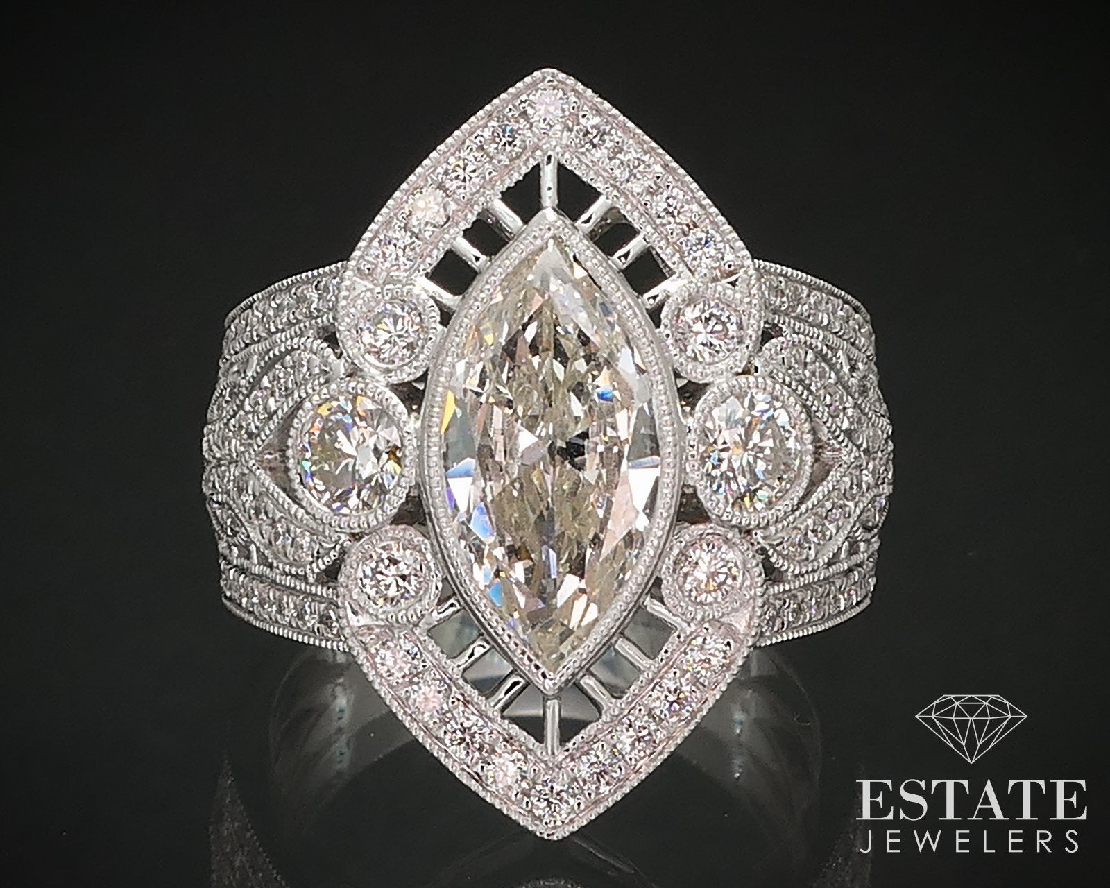 Sparkling ladies filigree cocktail style engagement ring with approximately 2.16ctw of diamonds and that's including the main GIA certified 1.41ct marquise cut diamond. SI1 clarity with K color to it. 21mm tall face. Stamped 14k SIZE-6. GIA number 2231333272
