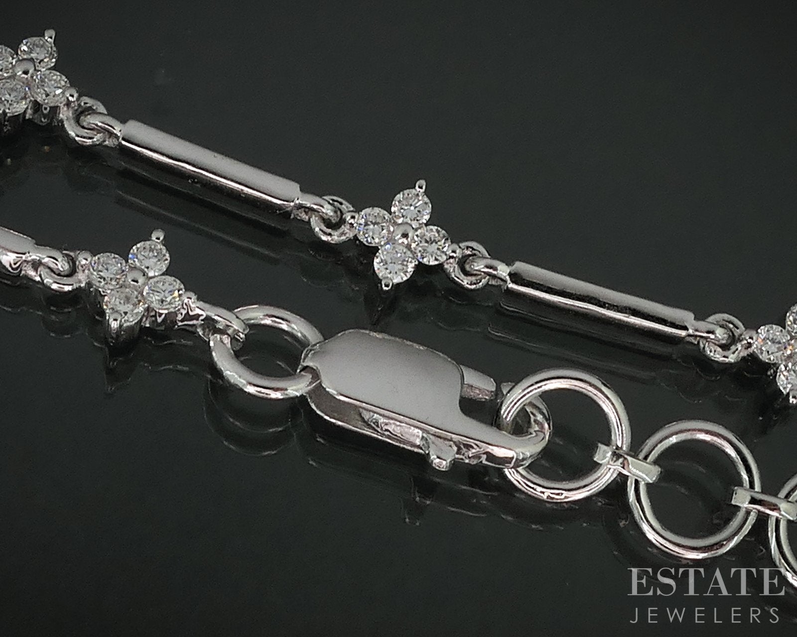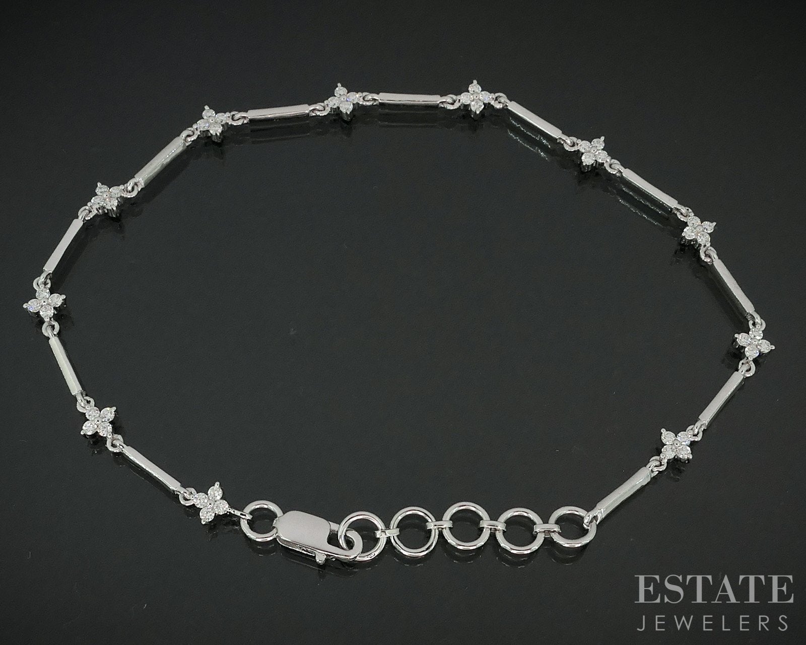 Additional Info: Stunning ladies tennis bracelet with sparkling round cut Diamonds set in flower shaped stations throughout! High polish bar links connect them all with jump rings added at the end to fit a variety of wrist sizes. Look for the matching flower necklace, earrings and cuff in our store!