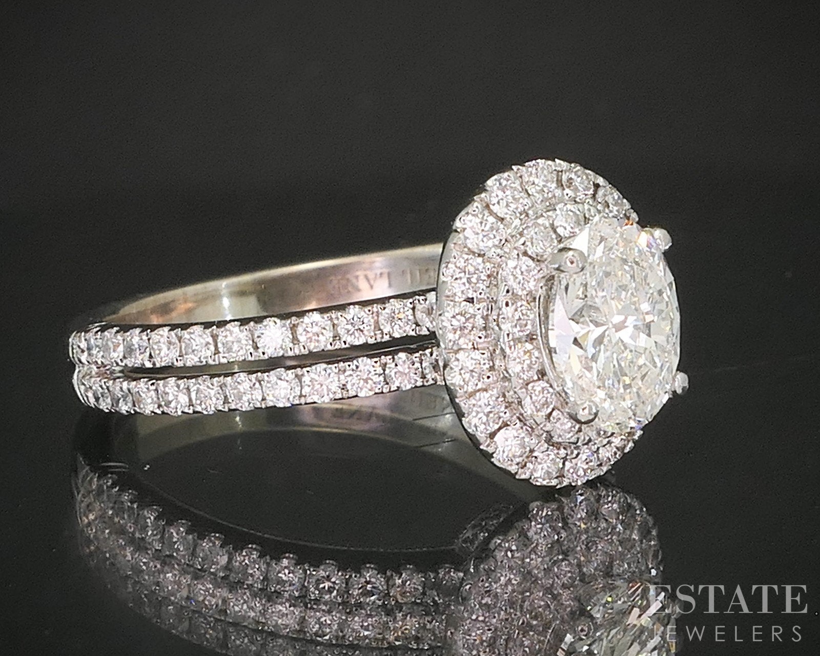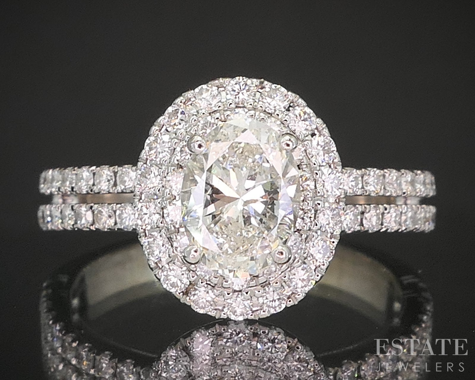 Additional Info: Timeless glamour meets designer elegance in this breathtaking Neil Lane engagement ring. At the heart of the design is a romantic oval-cut Diamond, renowned for its soft and brilliant facets that create a captivating play of light. The center stone is framed by a double halo of round-cut Diamonds, enhancing its size and radiance while adding vintage-inspired charm. Original retail for this piece is currently $4,499!