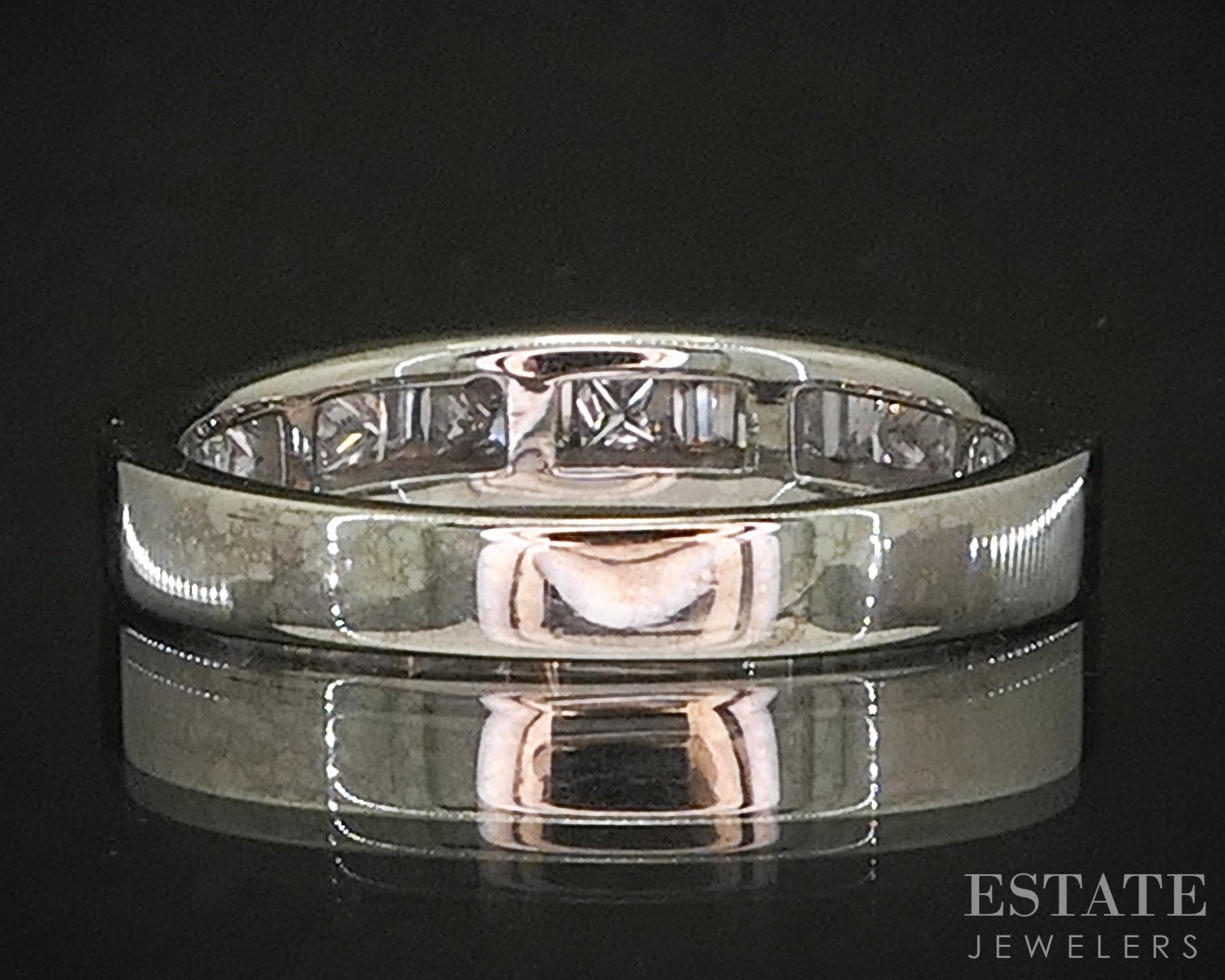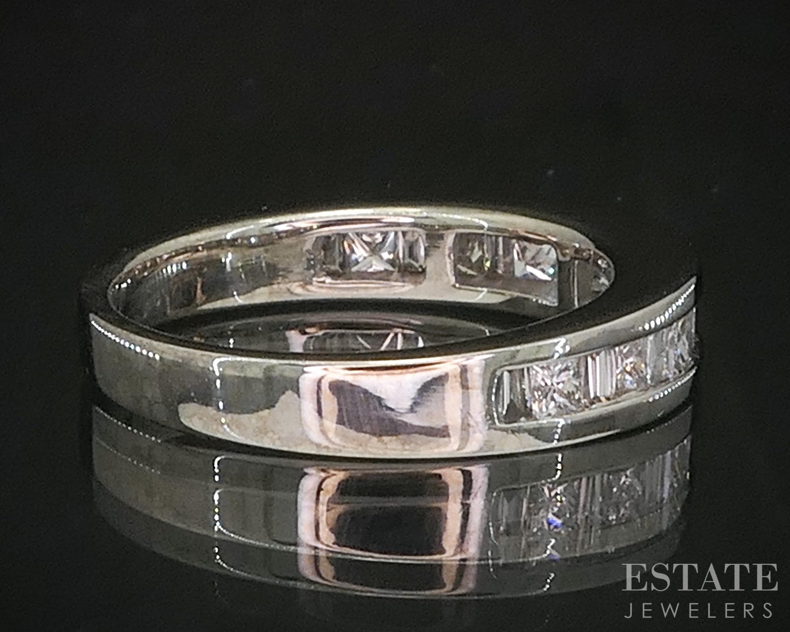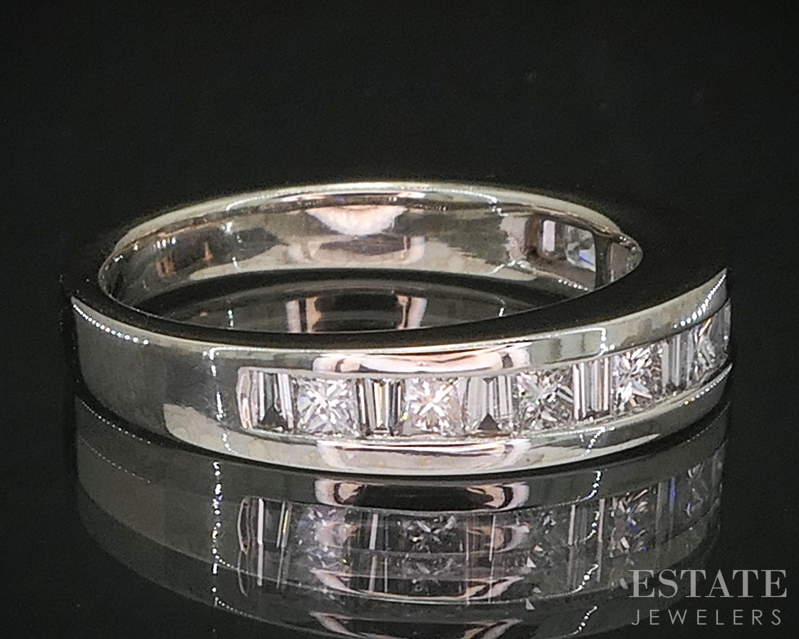 Additional Info: Lovely 4mm wedding band with a rare combo of baguette and princess cut Diamonds channel set throughout the front.
