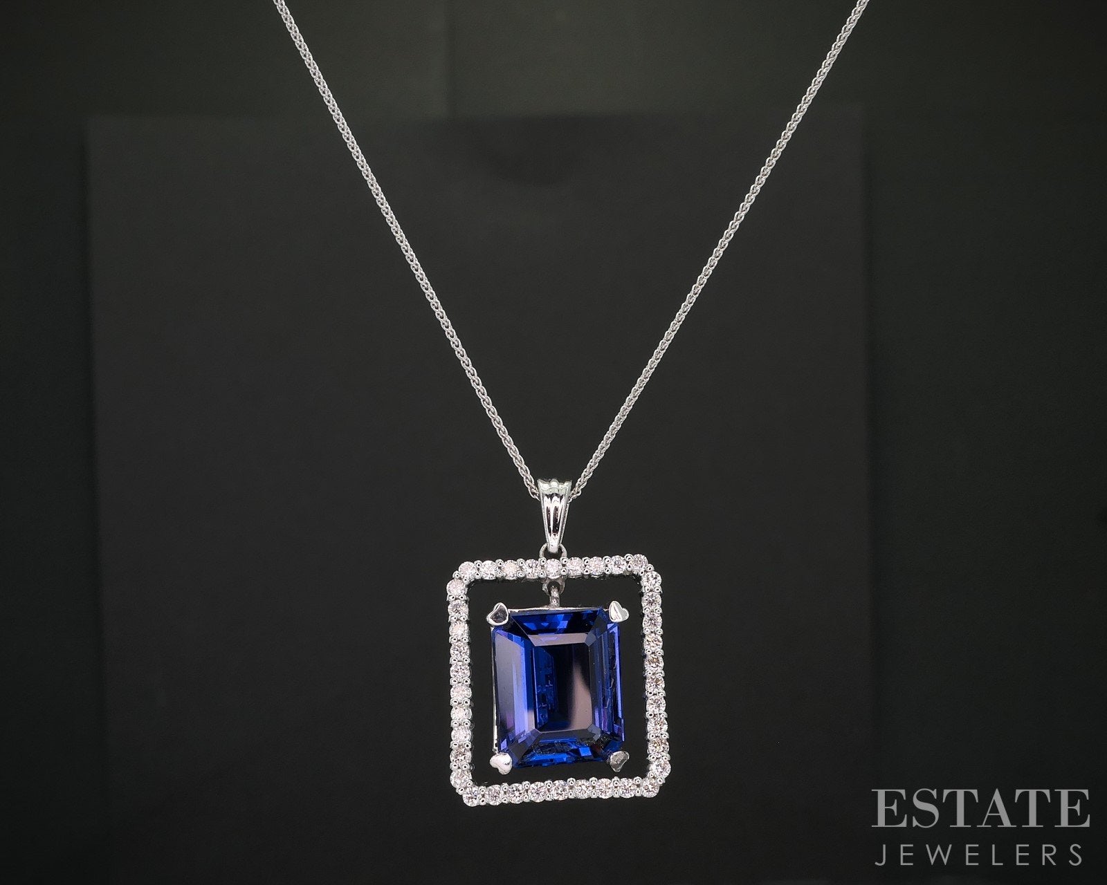 Additional Info: Exude timeless elegance with this exquisite pendant necklace, featuring a captivating emerald-cut Tanzanite at its center. Heart shaped prong set in luminous white gold, the richly saturated violet-blue Tanzanite is expertly faceted to enhance its brilliance and depth. Surrounding the center stone is a dazzling halo of round brilliant-cut Diamonds, adding a radiant sparkle that enhances the Tanzanite’s vivid hue. The halo setting not only amplifies the pendant's brilliance but also gives it a classic yet sophisticated appeal. Suspended from a sleek white gold chain, this pendant sits gracefully on the neckline, making it a perfect piece for both everyday luxury and special occasions.