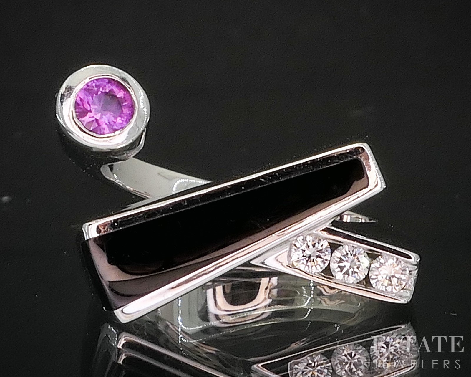 Additional Info: Striking and contemporary, this modernist ring is a bold statement of style and sophistication. Crafted in polished white gold, the design features a sleek Black Onyx centerpiece, its smooth surface creating a dramatic backdrop for vibrant accents. A Pink Sapphire introduces a vivid pop of color, while sparkling Diamonds add brilliance and contrast, highlighting the ring’s geometric elegance. With its clean lines and artistic balance of light and dark, this piece embodies modernist design—refined, expressive, and unforgettable.