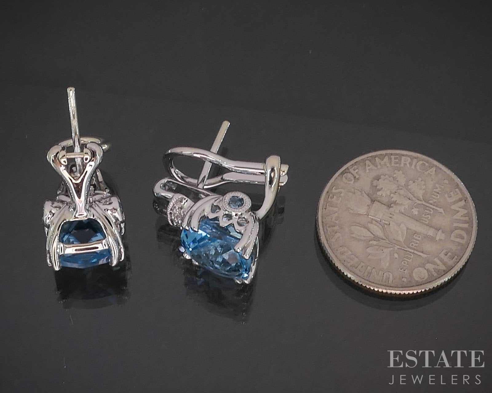 14k White Gold Natural Blue Topaz & Diamond Omega Back Earrings 5.4g p16147b