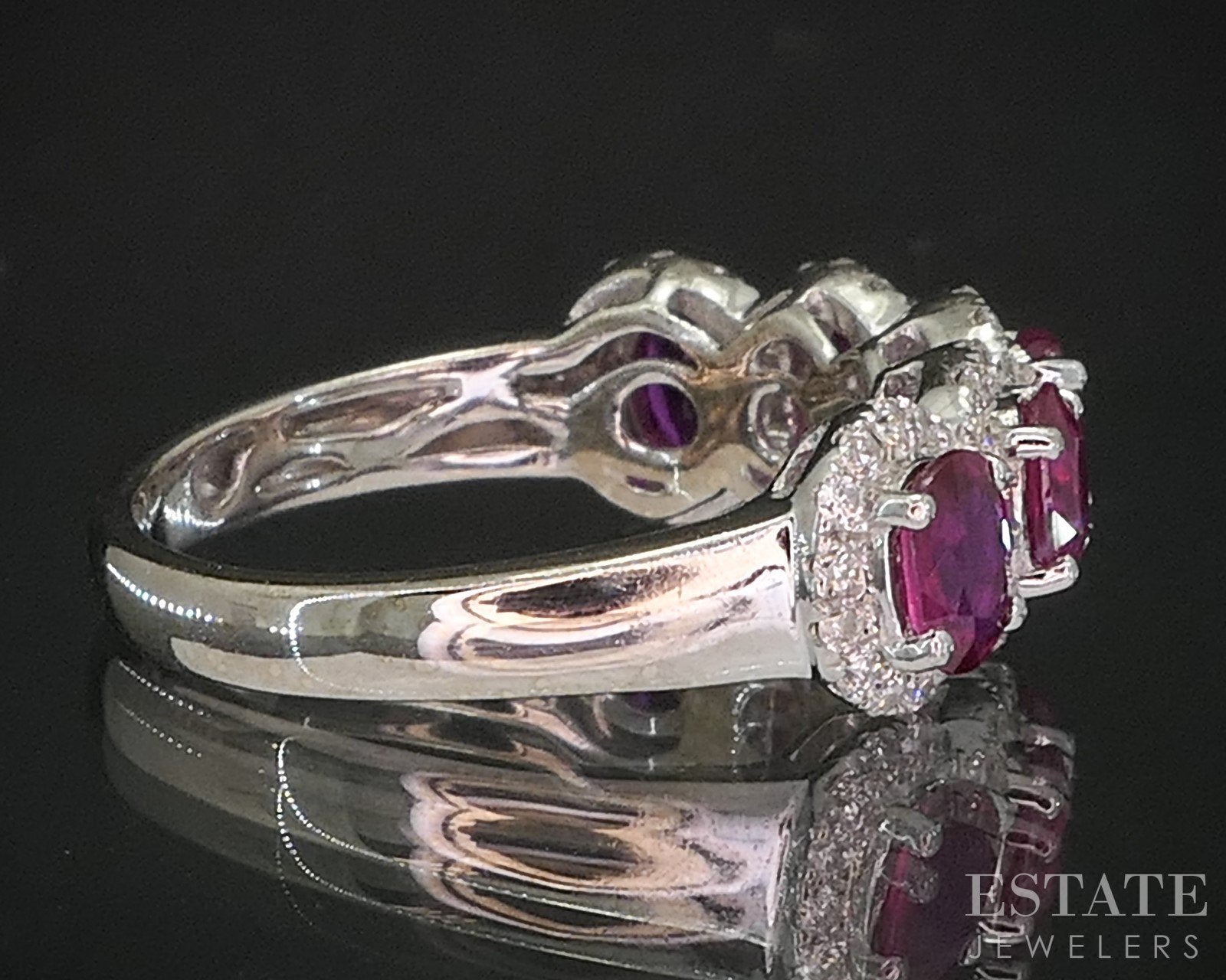 Additional Info: Lovely ladies band with five vivid Ruby and sparkling halos of Diamonds around them. Look for the matching earrings in our store.