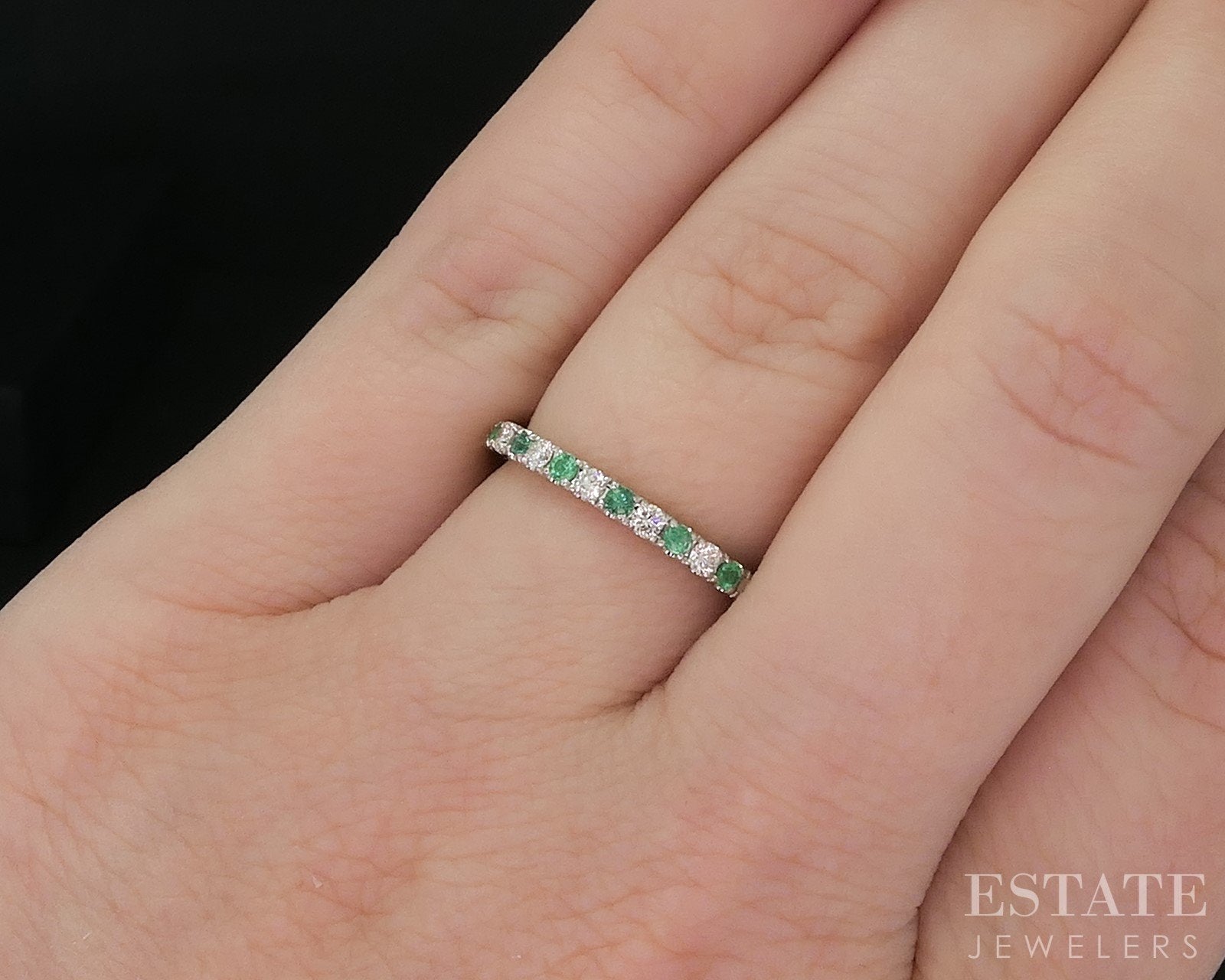 Additional Info: Lovely 2mm wedding band from Neil Lane with vivid Emeralds and sparkling Diamonds alternating on the front.
