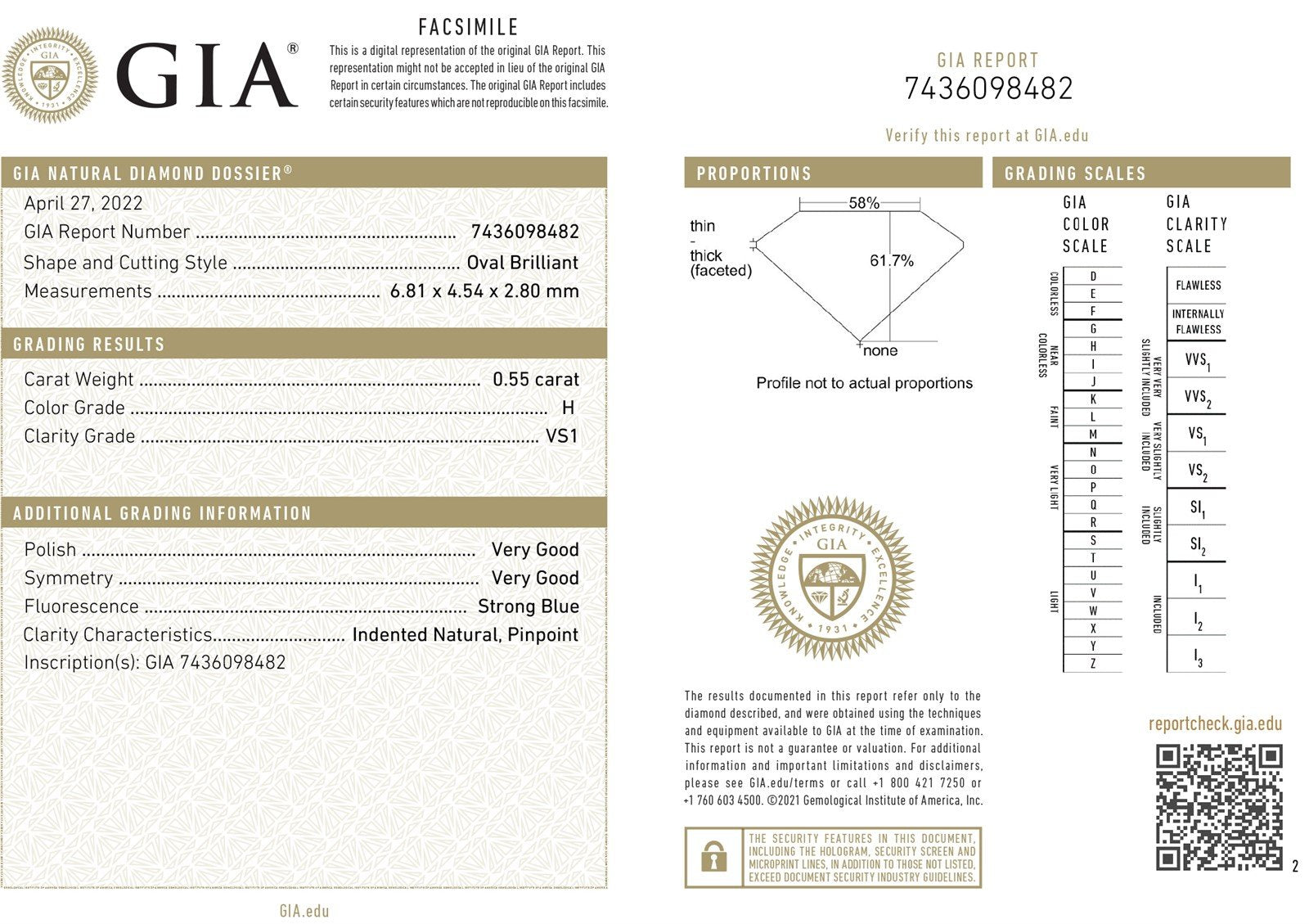 Diamond Information: Approximately 1.00ctw including the .55ct main oval cut GIA certified Diamond, VS1 clarity with H color to it. GIA number 7436098482