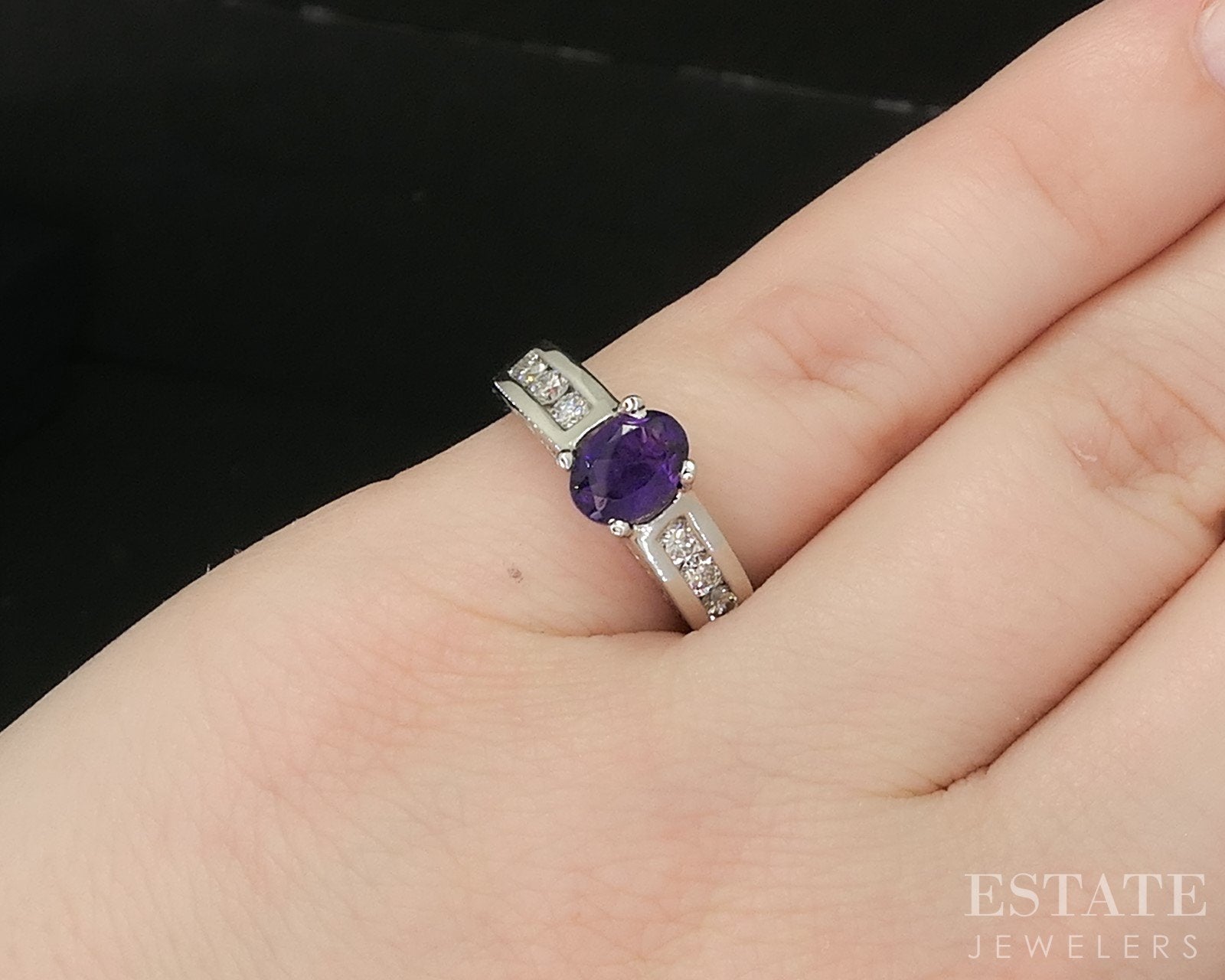 14k White Gold Oval Natural Amethyst & Diamond Ladies Ring 4.3g p15552