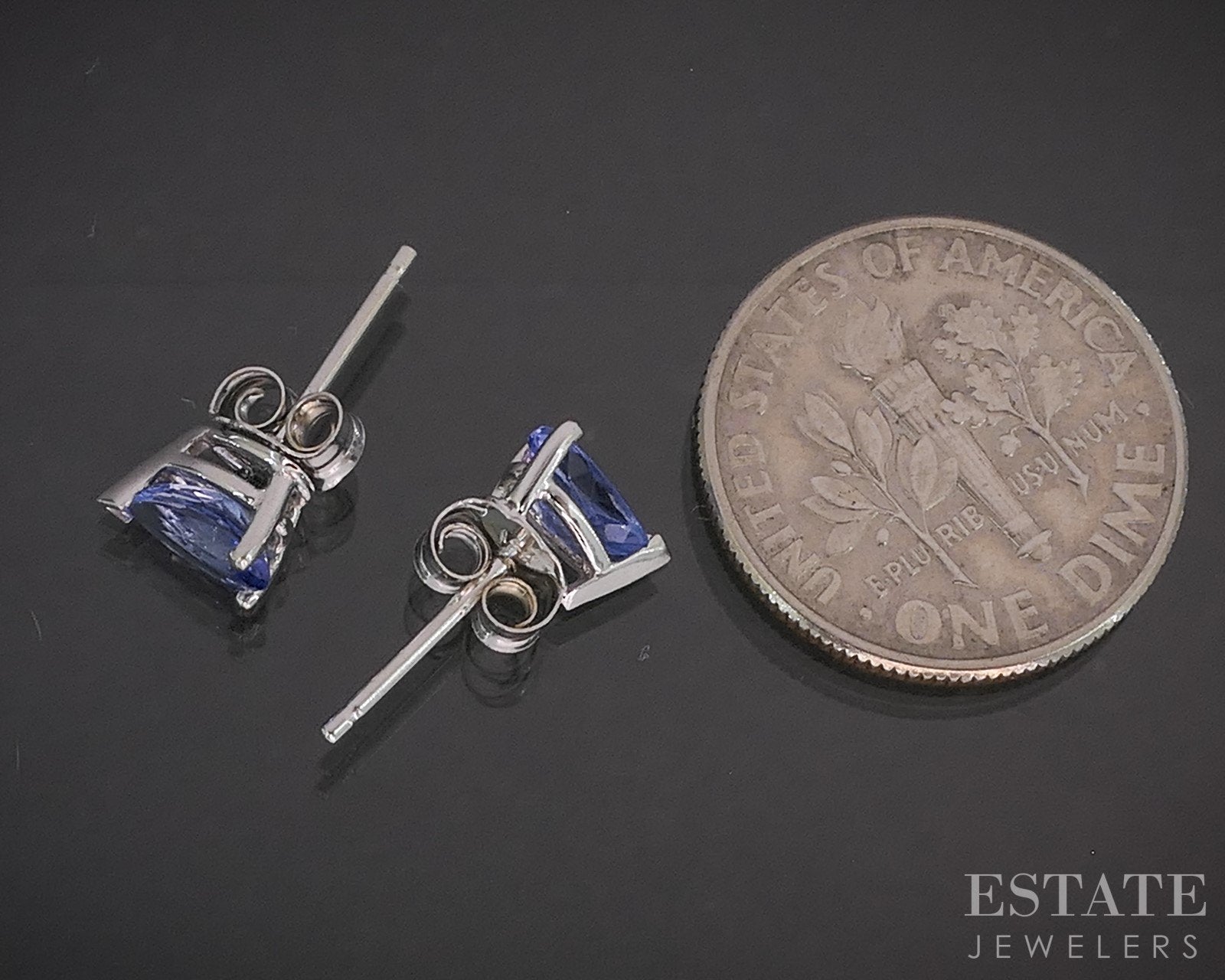 Additional Info: Lovely stud earrings with vivid Tanzanite gems set on the front.
