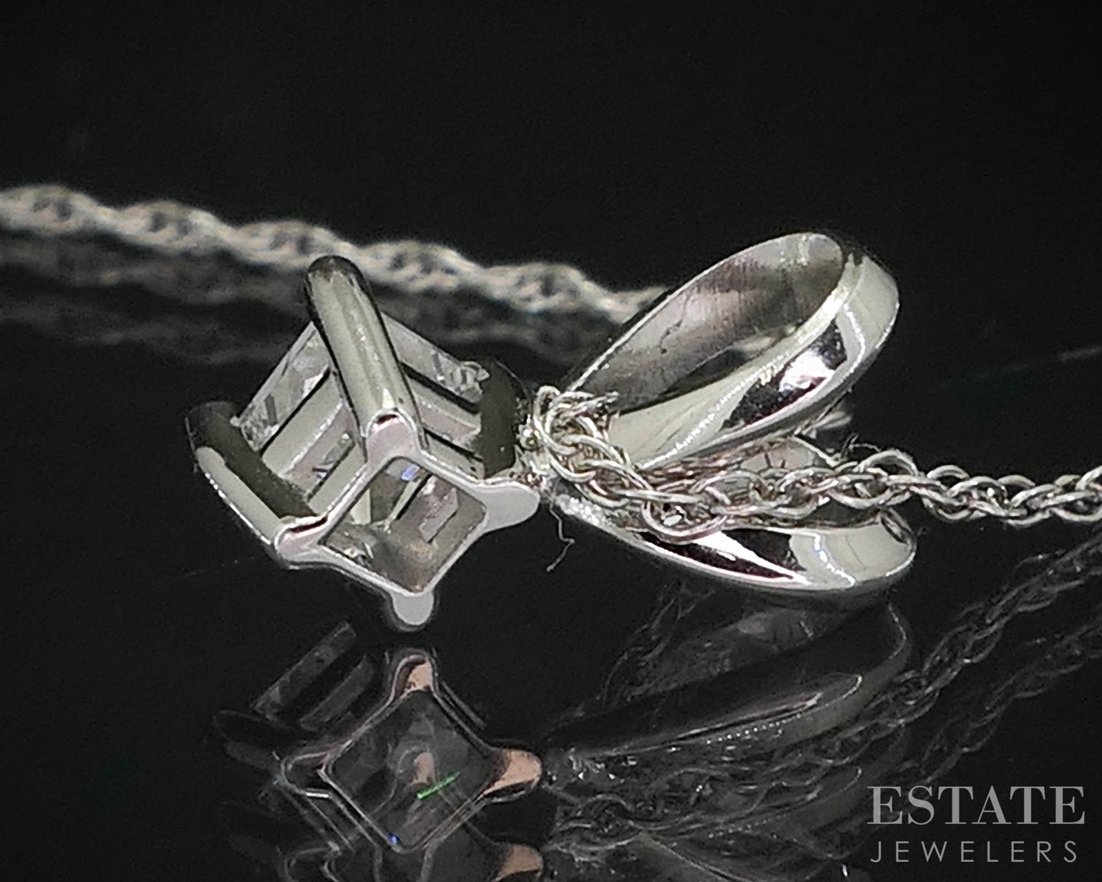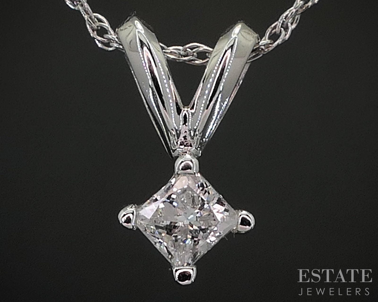 Additional Info: Elegant in its simplicity, this stunning necklace features a dazzling princess-cut Diamond, expertly set as a solitaire in lustrous white gold. Suspended from a delicate white gold chain, the Diamond catches the light with every movement, offering timeless beauty and understated luxury. Perfect for everyday elegance or special occasions.