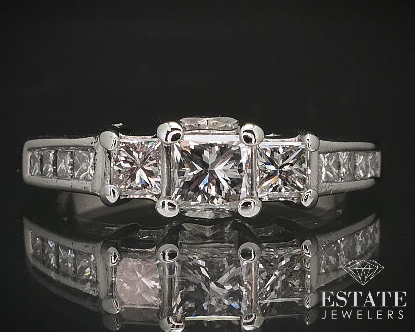 Stunning engagement ring with a princess cut diamonds set. Approximately .65ctw combined and that's including the main approximate .25ct princess cut diamond. SI clarity and JK color to it. Look for matching wedding band, i17108 in our store. stamped 14k SIZE-6