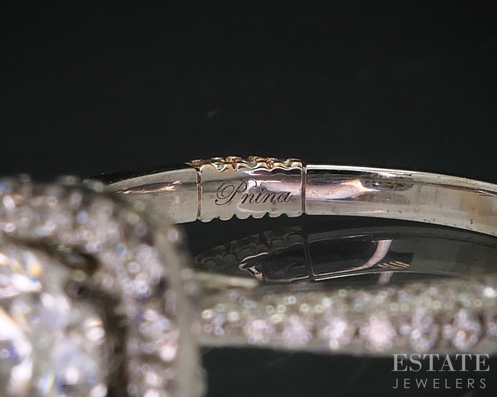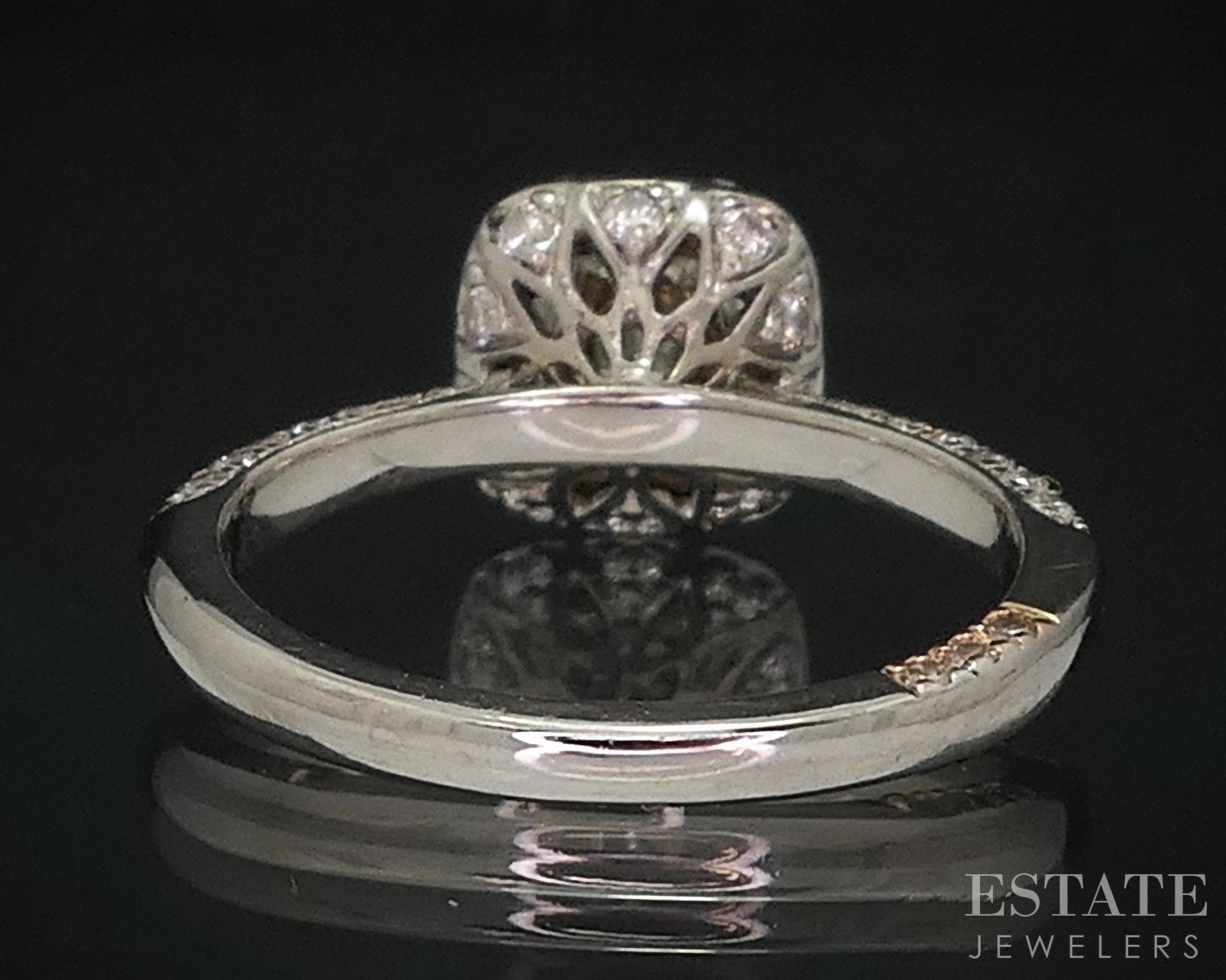 Additional Info: Sparkling halo style engagement ring Pnina Tornai with round cut Diamonds on all sides of the front of the head and setting! 9mm tall head. Unique rose gold section on the back of the band.