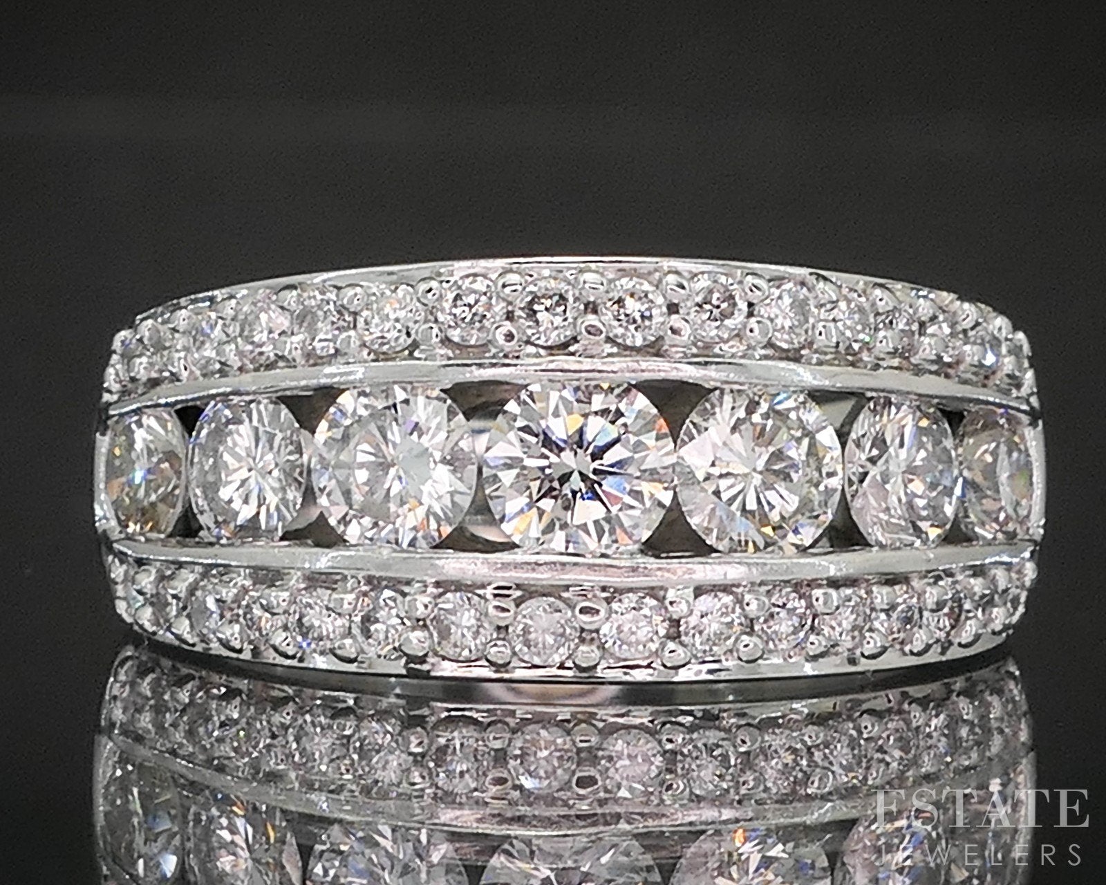 Additional Info: Graceful and contemporary, this right-hand statement band in white gold blends modern design with timeless brilliance. Three sleek bands of lustrous white gold meticulously adorned with shimmering Diamonds, creating a dazzling array of light that catches the eye from every angle. Perfect as a statement ring, anniversary band, or a chic addition to a stacked look. This piece radiates elegance and craftsmanship, today and always. 9mm tall face.