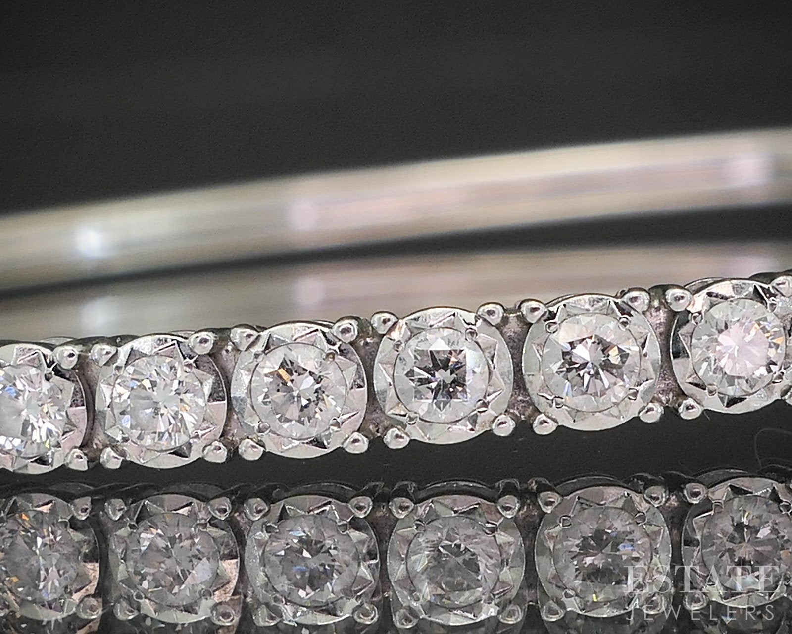 Additional Info: Lovely ladies bangle bracelet with sparkling round cut Diamonds on illusion settings. This beauty is hinged in the middle to make getting the bracelet on and off easy!