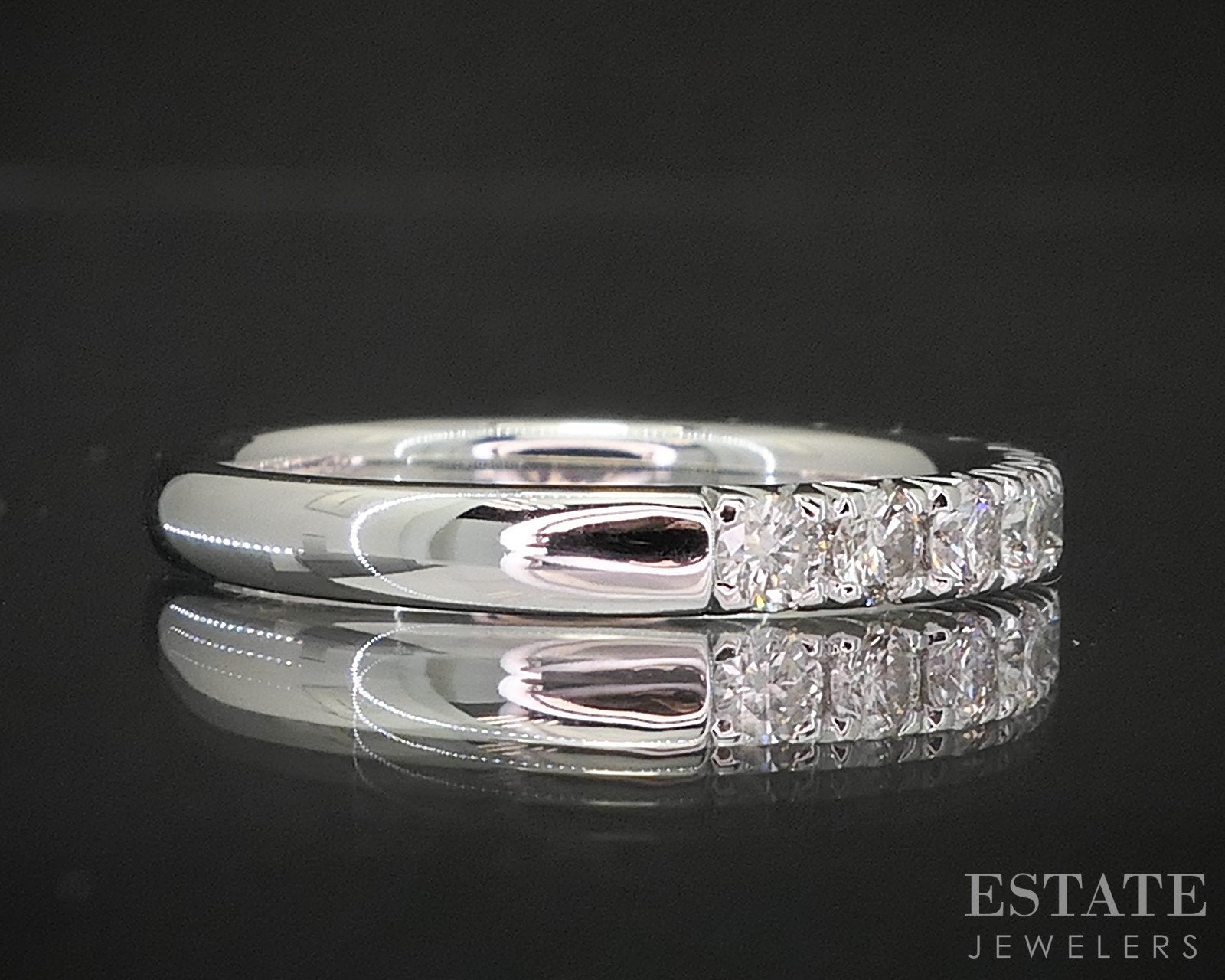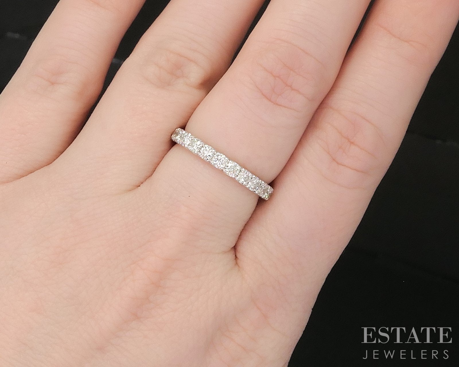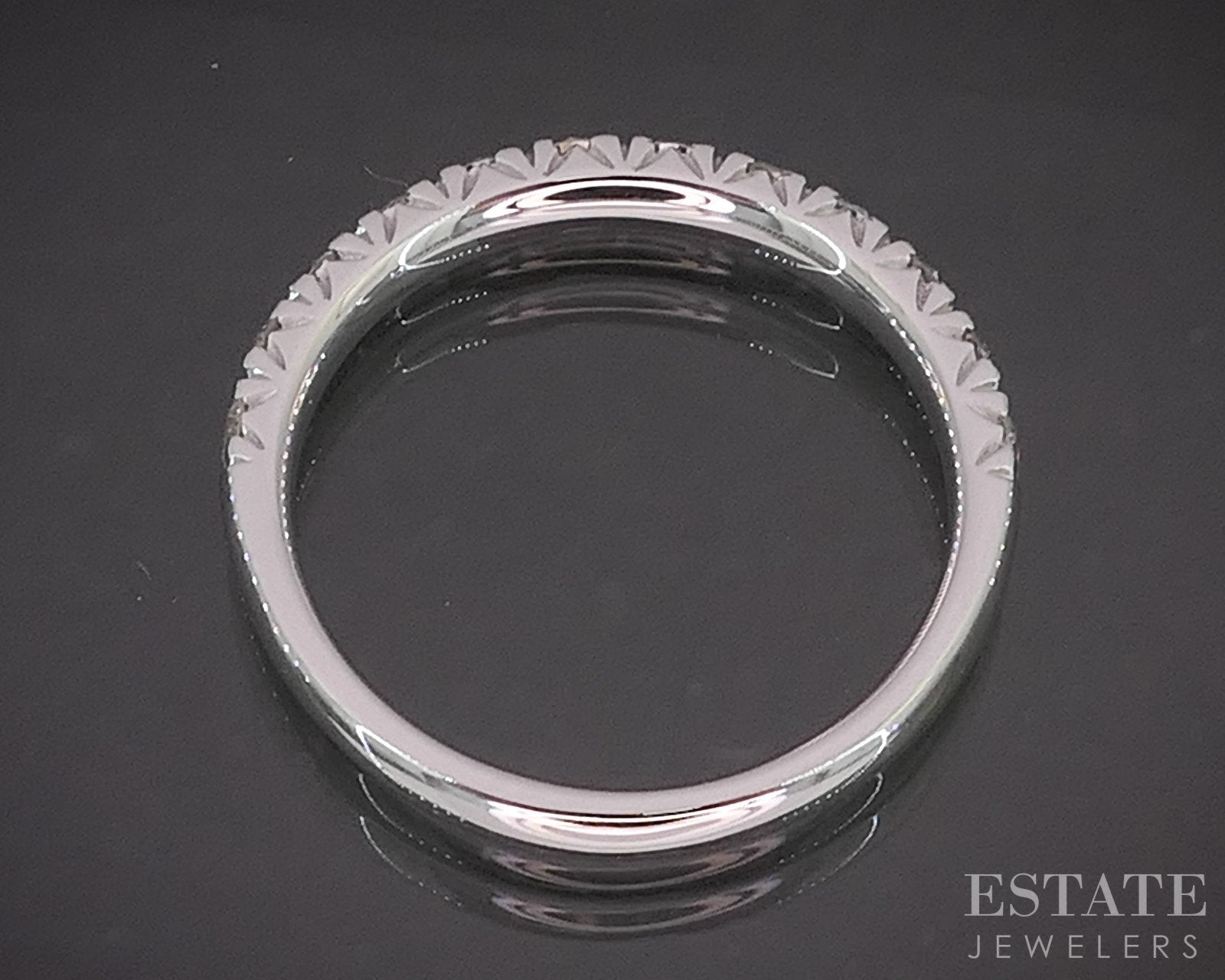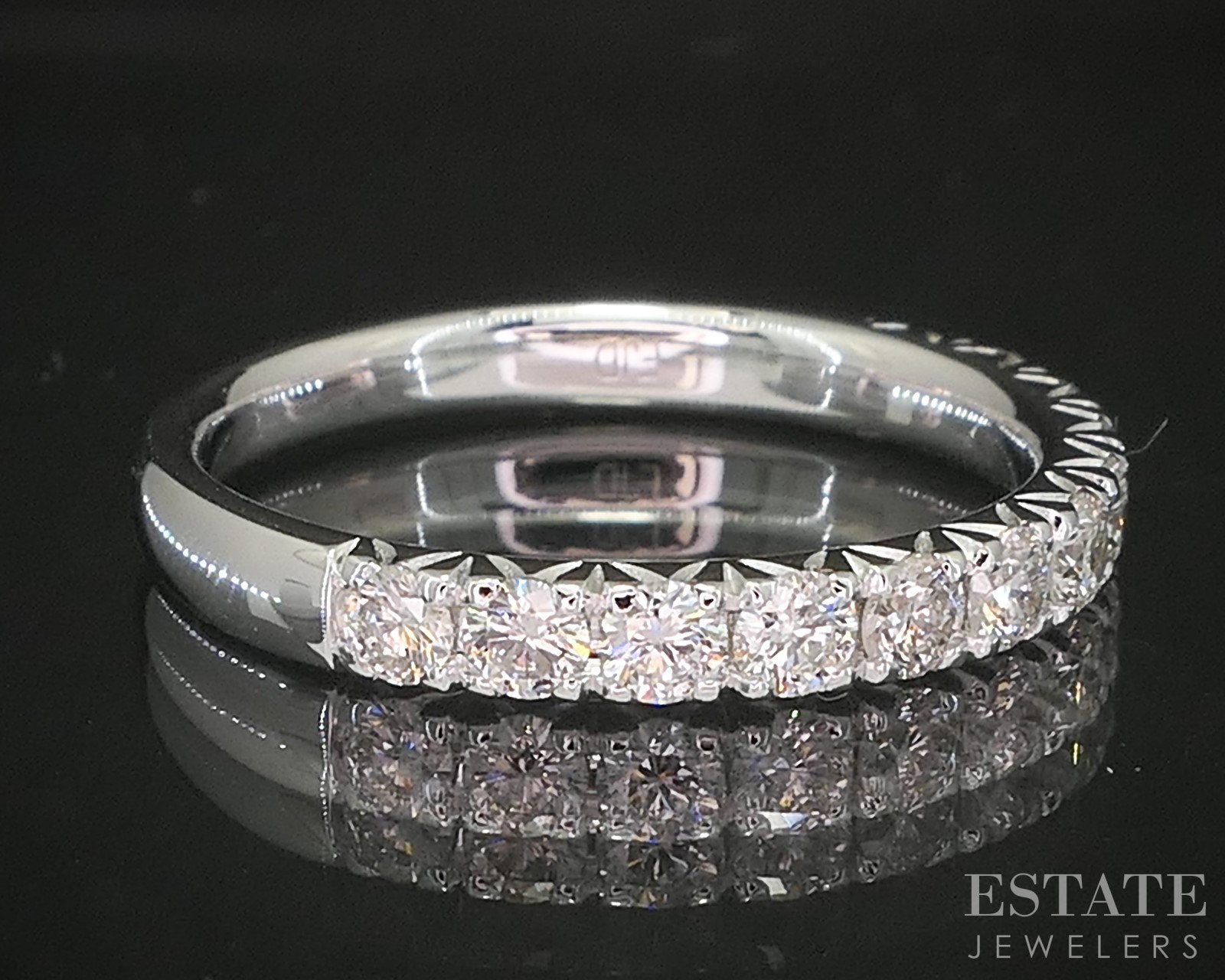 Additional Info: Timeless and refined, this white gold wedding band is a beautiful symbol of enduring love. Crafted in gold, the band features a row of sparkling round-cut Diamonds set securely in a sleek shared prong setting. The clean lines of the design highlight the brilliance of the Diamonds while offering a smooth, comfortable fit, perfect for everyday wear. Elegant on its own or paired with an engagement ring, this band blends classic style with lasting sophistication. 2.7mm wide