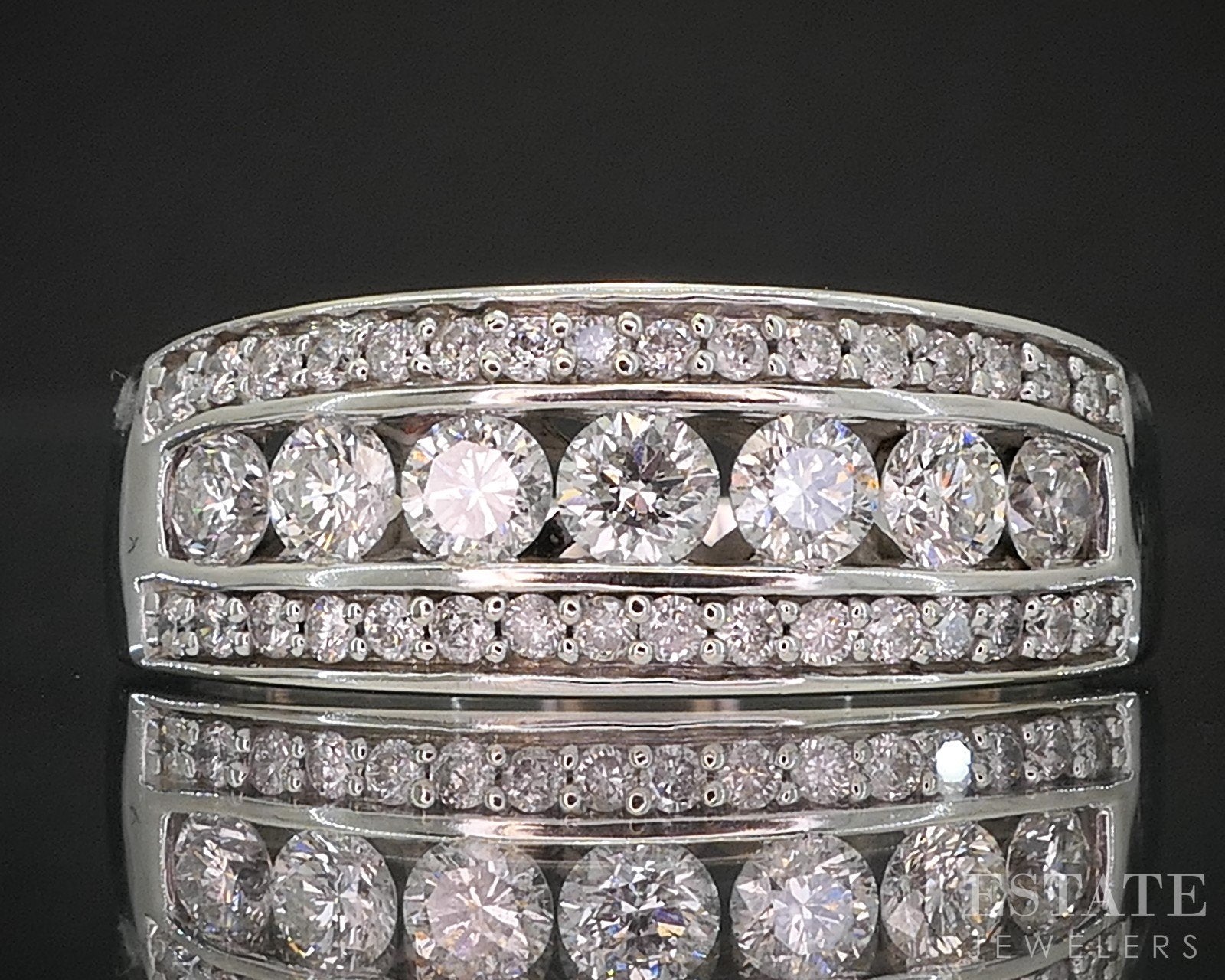 Additional Info: Charming band ring with multiple rows of round cut Diamonds set on the face. 8mm tall.