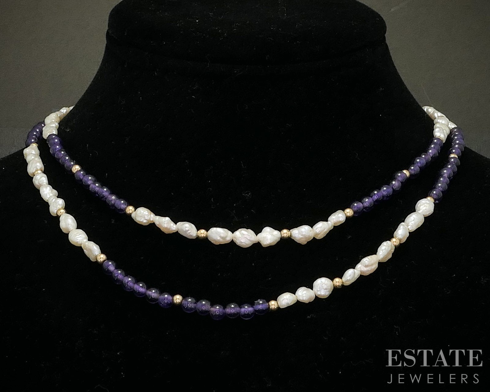 14k Yellow Gold 5mm Freshwater Pearl & Amethyst Beaded Necklace 32"L i20167b