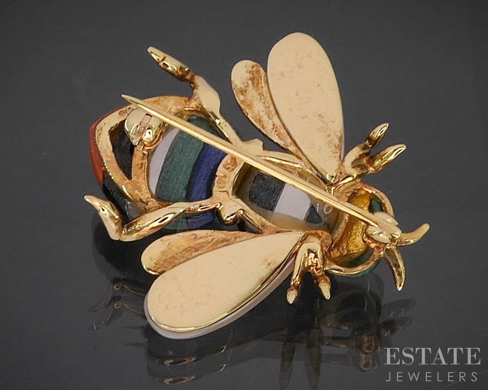 Additional Info: This charming bee-shaped pin brooch by Asch Grossbardt is a delightful example of the brand’s masterful craftsmanship and signature inlay artistry. Crafted in rich yellow gold, the whimsical bug form is brought to life with vibrant inlaid gemstones that highlight its graceful silhouette and playful character. Subtle detailing and impeccable finishing showcase Asch Grossbardt’s dedication to precision and design. Both elegant and endearing, this piece is a wearable work of art — a perfect accent for collectors who appreciate fine jewelry with personality and charm