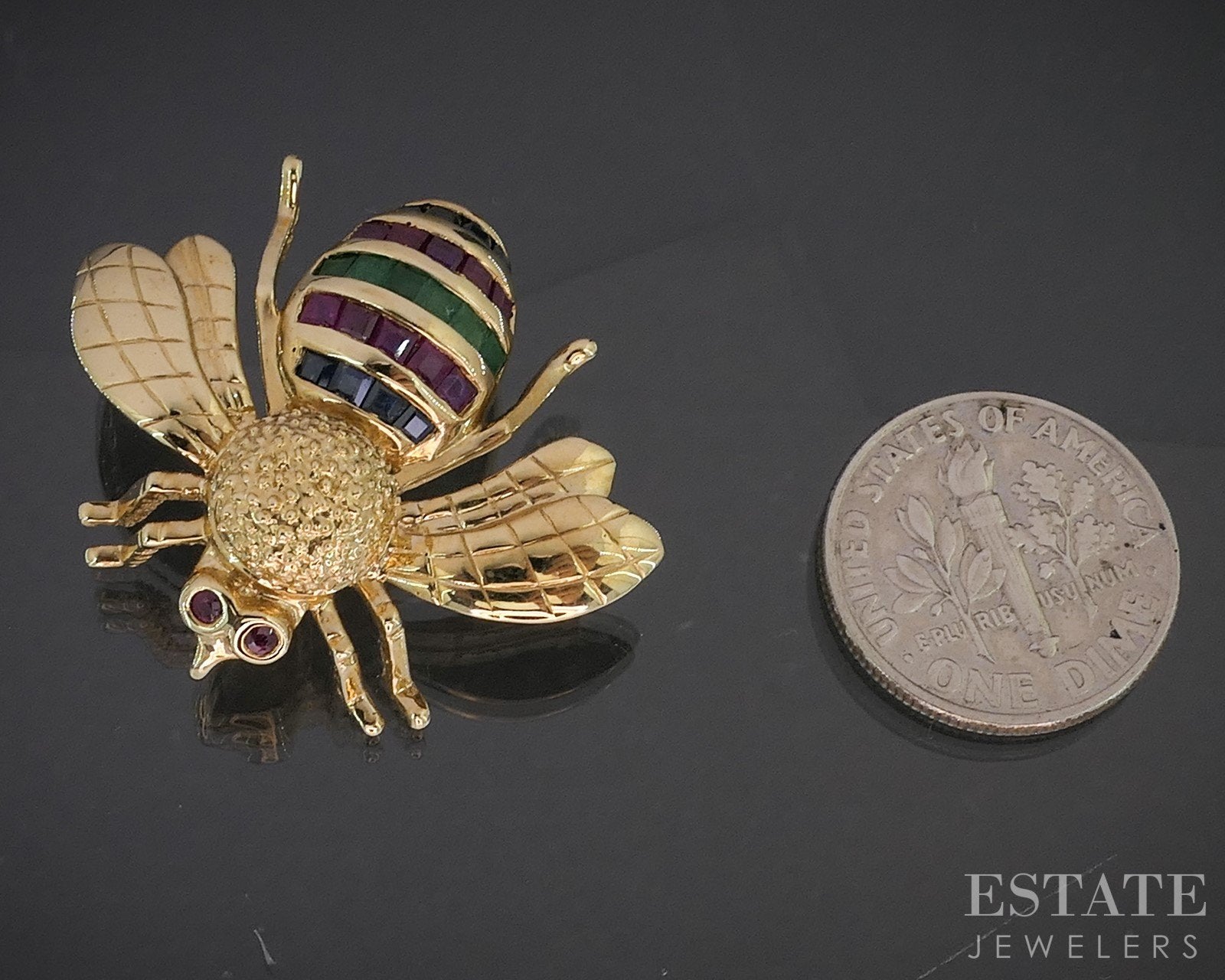 Additional Info: Rare designer brooch from the famed Bellarri! Shaped like a genuine Bee with natural Ruby eyes and more Rubies, Blue Sapphires and Emeralds on the body! A true collectors piece that you wont want to miss out on.