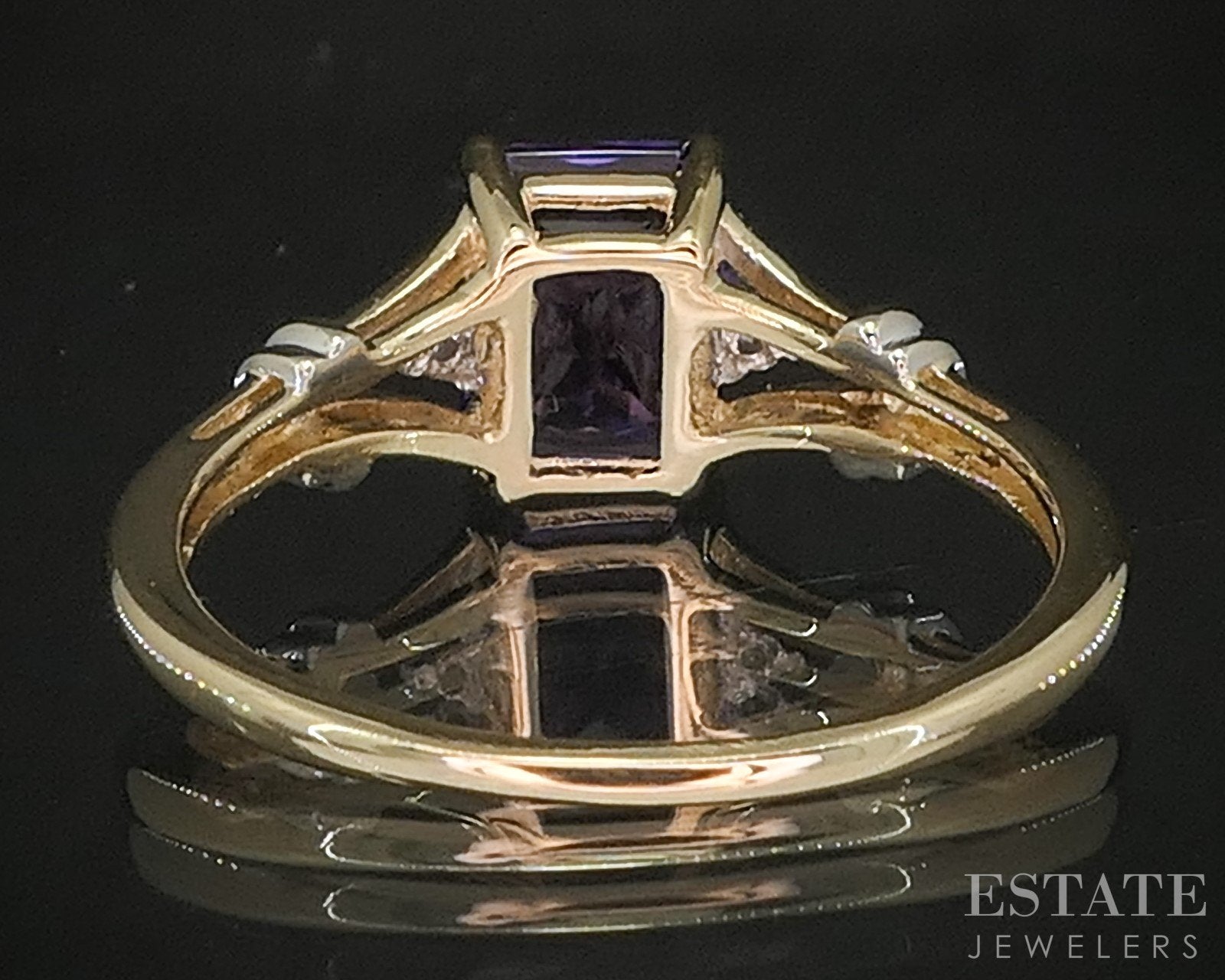 Additional Info: Rich in color and timeless in design, this emerald cut Amethyst and Diamond ring is a striking statement of elegance. The centerpiece is a vivid emerald-shaped Amethyst, known for its deep purple hue and natural brilliance. Framed by delicate accents of sparkling white Diamonds, the gemstone radiates a captivating contrast against the warm glow of yellow gold.