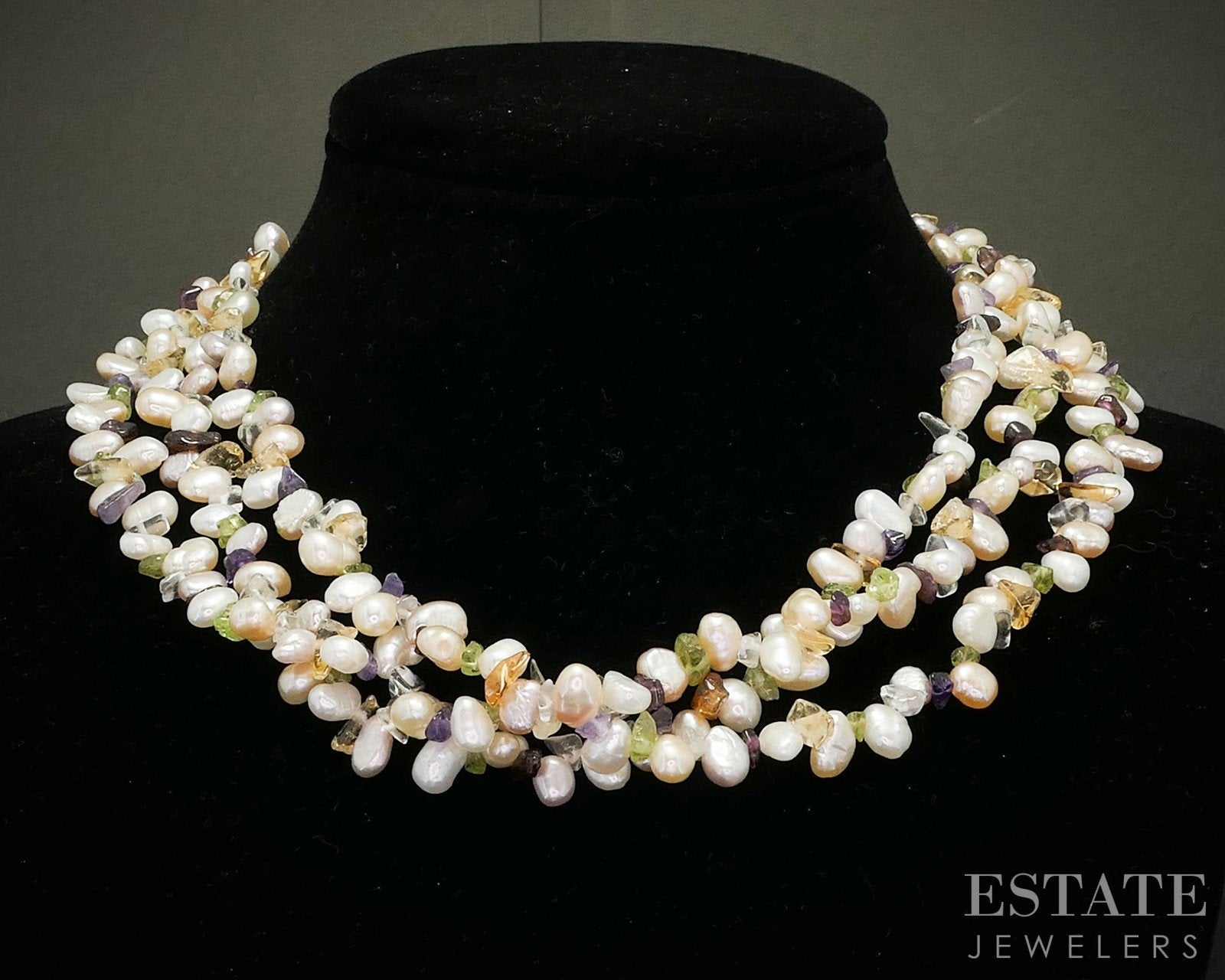 Additional Info: Lovely ladies necklace with multiple strands of lustrous Pearls and vivid gemstones strung together.