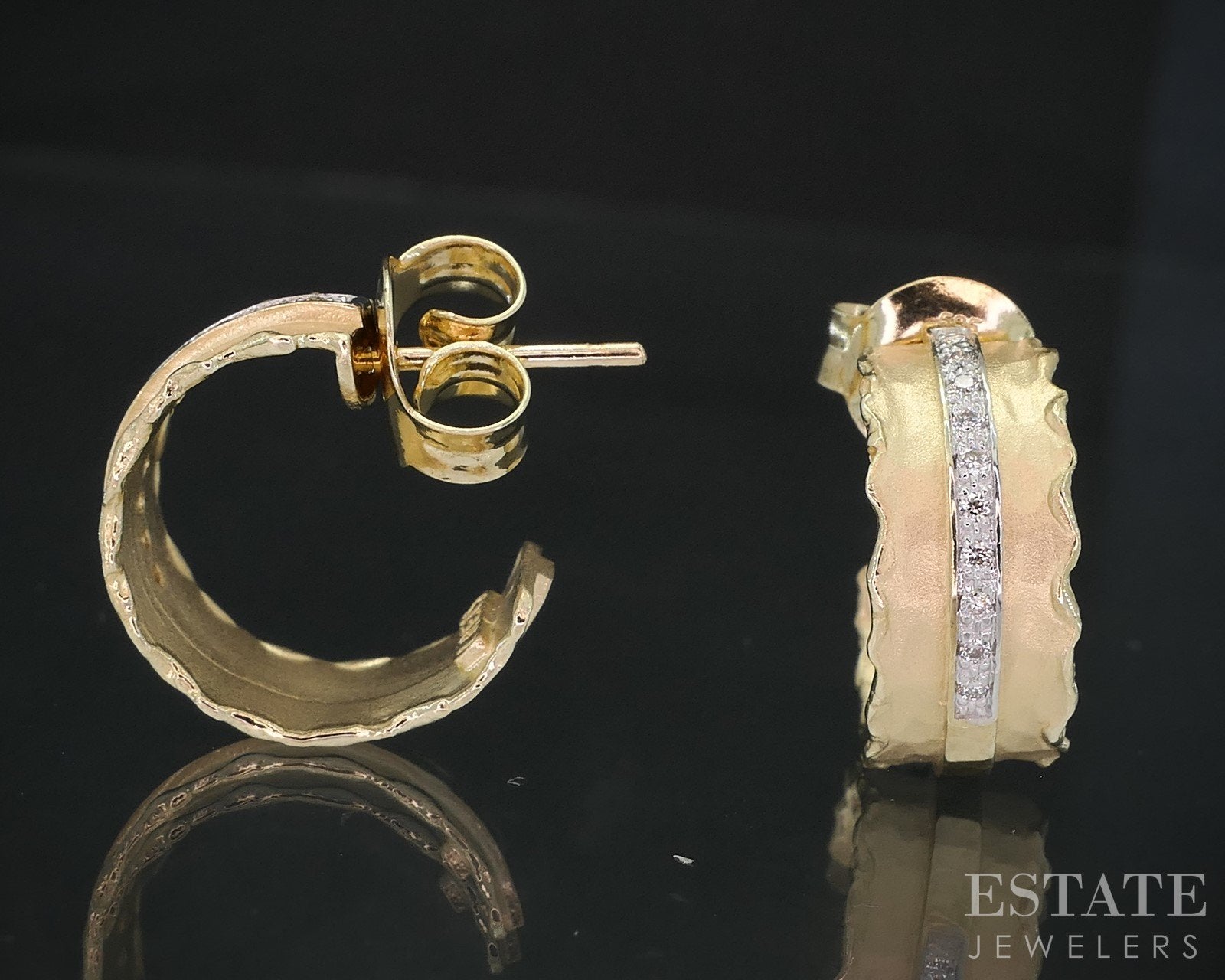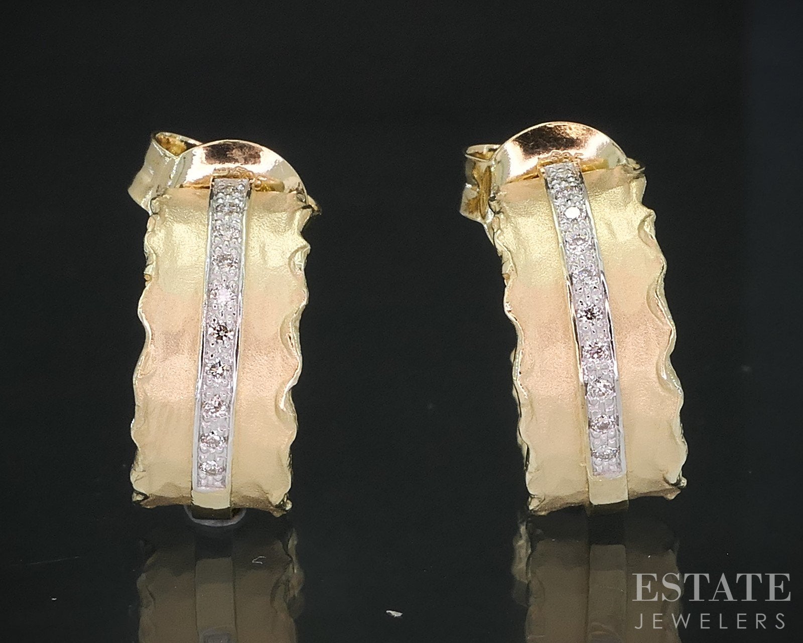 Additional Info: Charming huggie earrings from the I. Reiss "Gallery Collection" with round cut Diamonds set in the white gold section of the front. Hammered matte and ruffled edge designs throughout the front thats common with I. Reiss jewelry. Look for the matching band in our store, i19107!