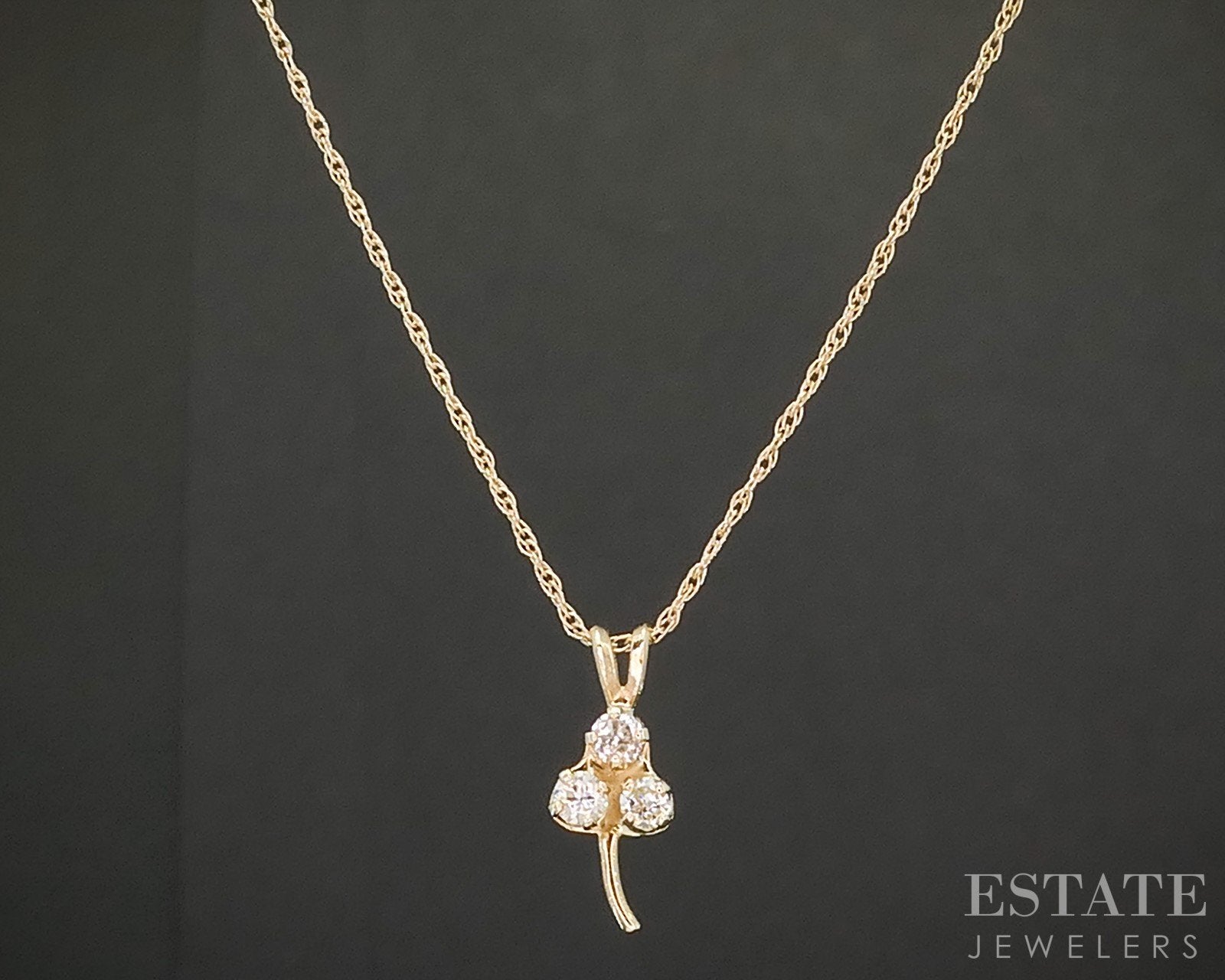 Additional Info: Sparkling ladies necklace with a round cut Diamonds set on the 3-leaf clover pendant. Attached to a dainty rope chain. Look for the matching earrings!