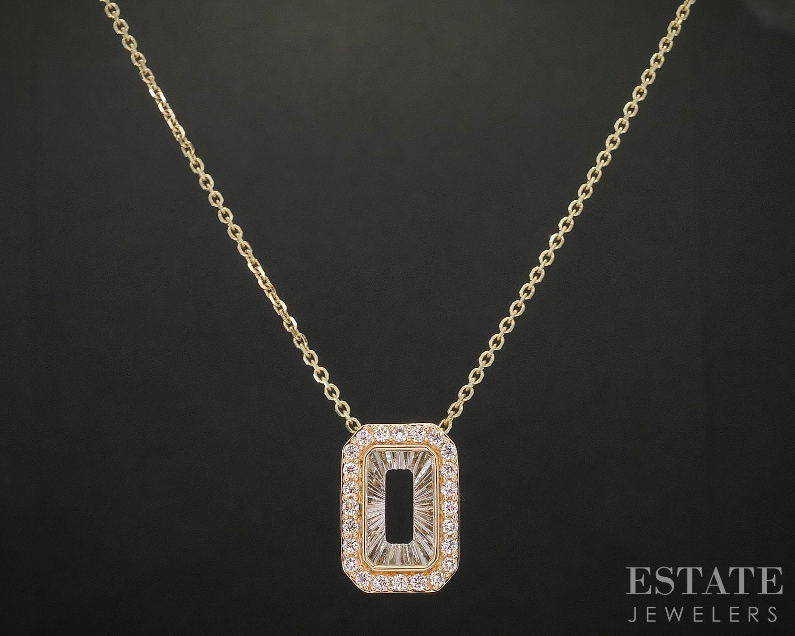 Additional Info: Sparkling ladies necklace with a round cut Diamond set on the outside of the block "O" pendant. Attached to a dainty cable chain.