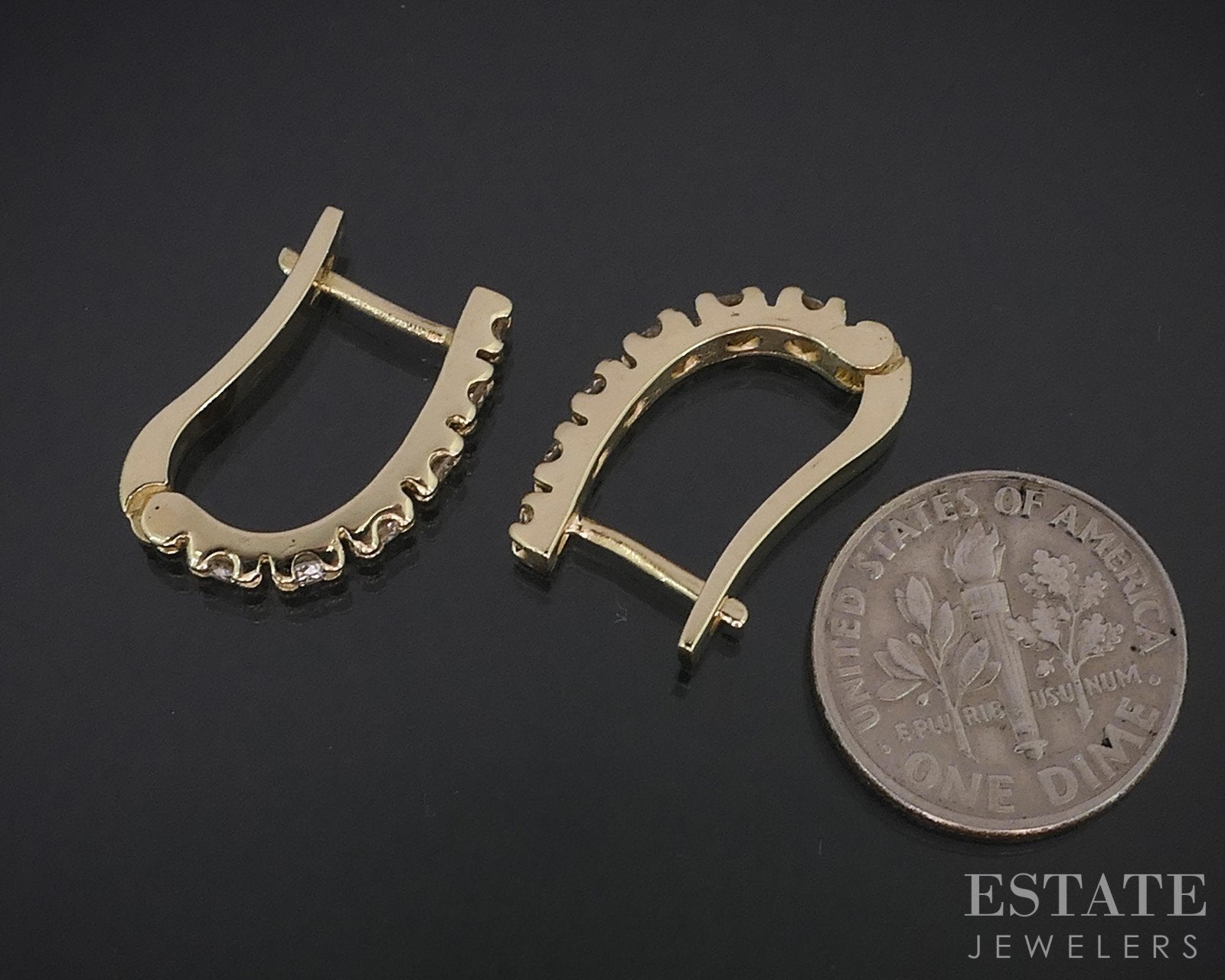 Additional Info: Sparkling ladies J-hoops with round cut Diamonds prong set up and down the face. Hinged at the bottom to make these beauties easy and comfortable to wear!