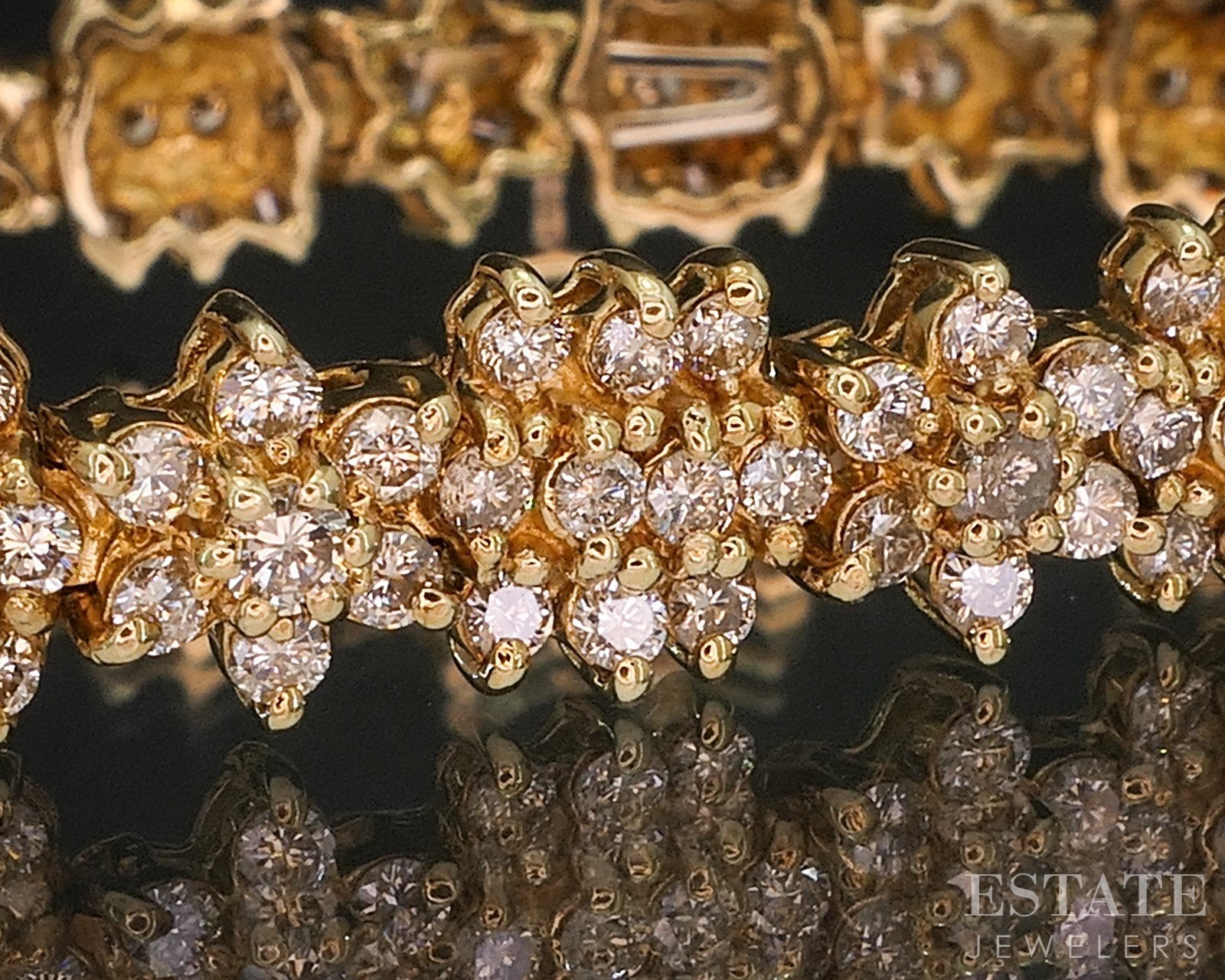 Additional Info: Radiate timeless elegance with this exquisite Diamond flower tennis bracelet, crafted in warm yellow gold. Featuring meticulously arranged Diamond clusters, this bracelet offers the brilliance of larger stones with the added sparkle of multiple facets. Each cluster is expertly set to maximize fire and brilliance, creating a dazzling, high-impact look with every movement. Secured with a push button clasp and safety latch, this piece combines classic sophistication with modern glamour — perfect for both special occasions and everyday luxury.
