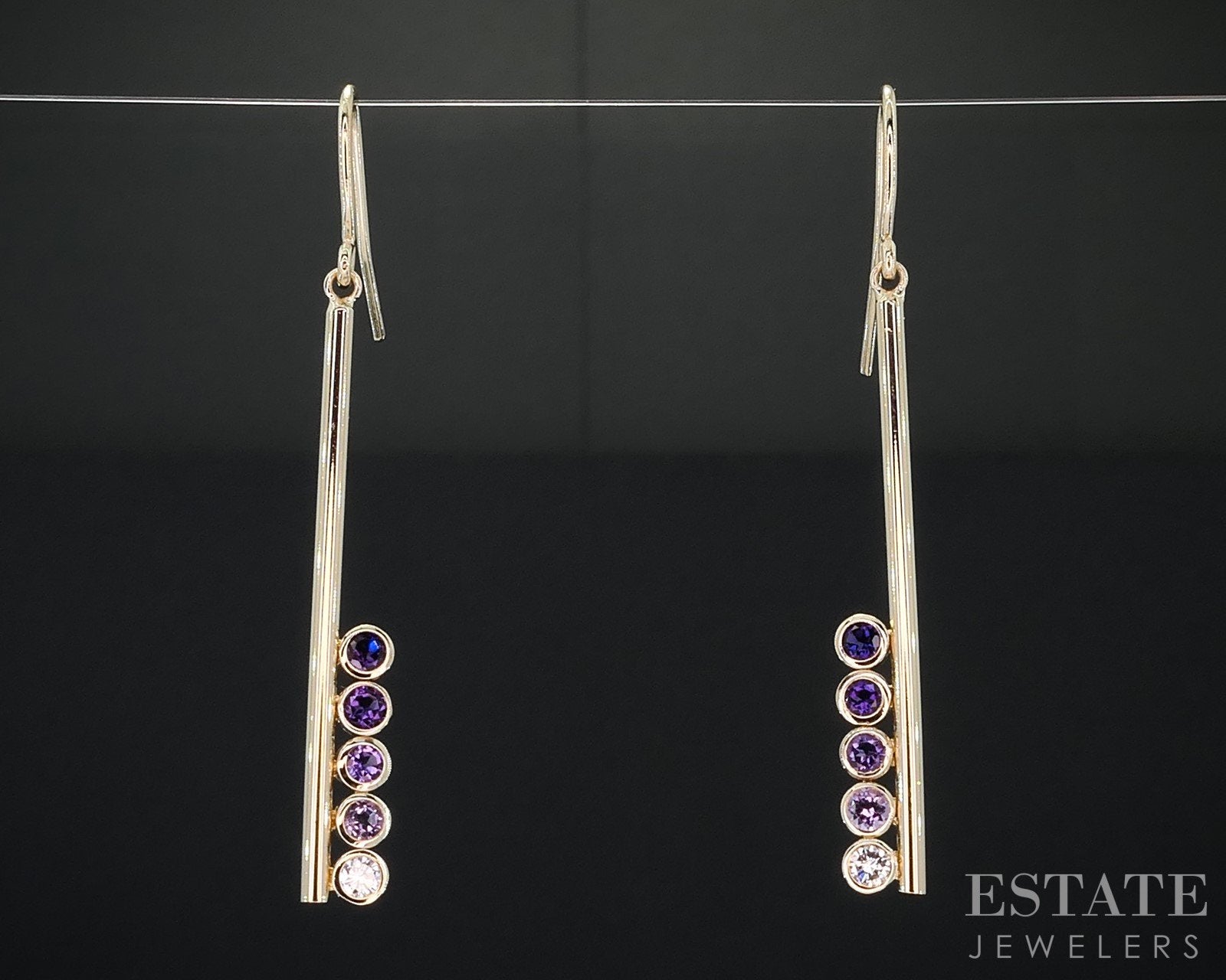 Additional Info: Lovely bar dangle earrings from our in house designer, Courtney Bache. Four different shades of graduating purple Amethyst gems set in a row above a sparkling Diamond. All of which are bezel set.
