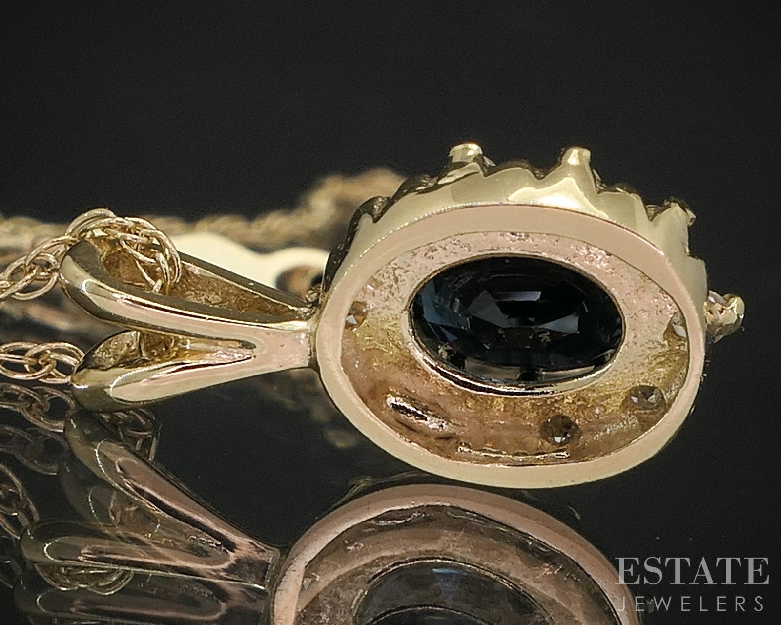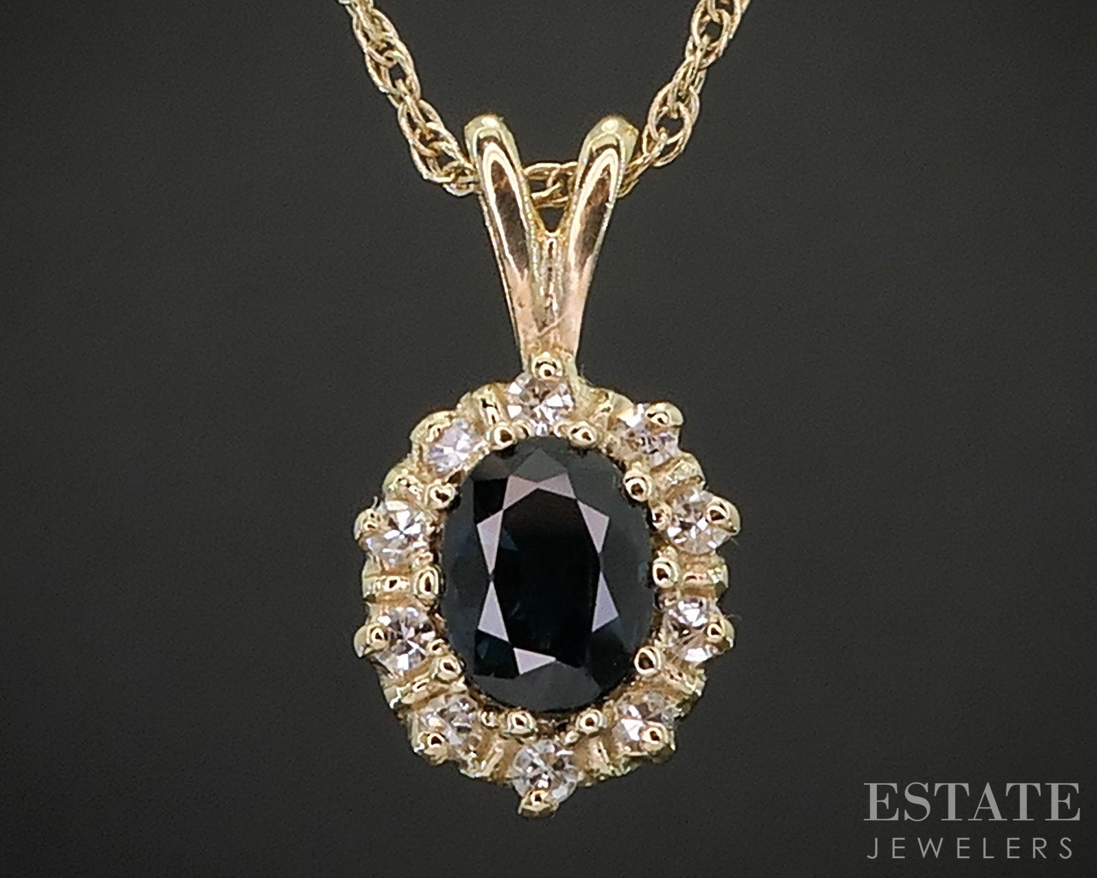 Additional Info: Lovely ladies pendant with sparkling Diamonds accenting the vivid Blue Sapphire. Attached to a dainty rope chain.