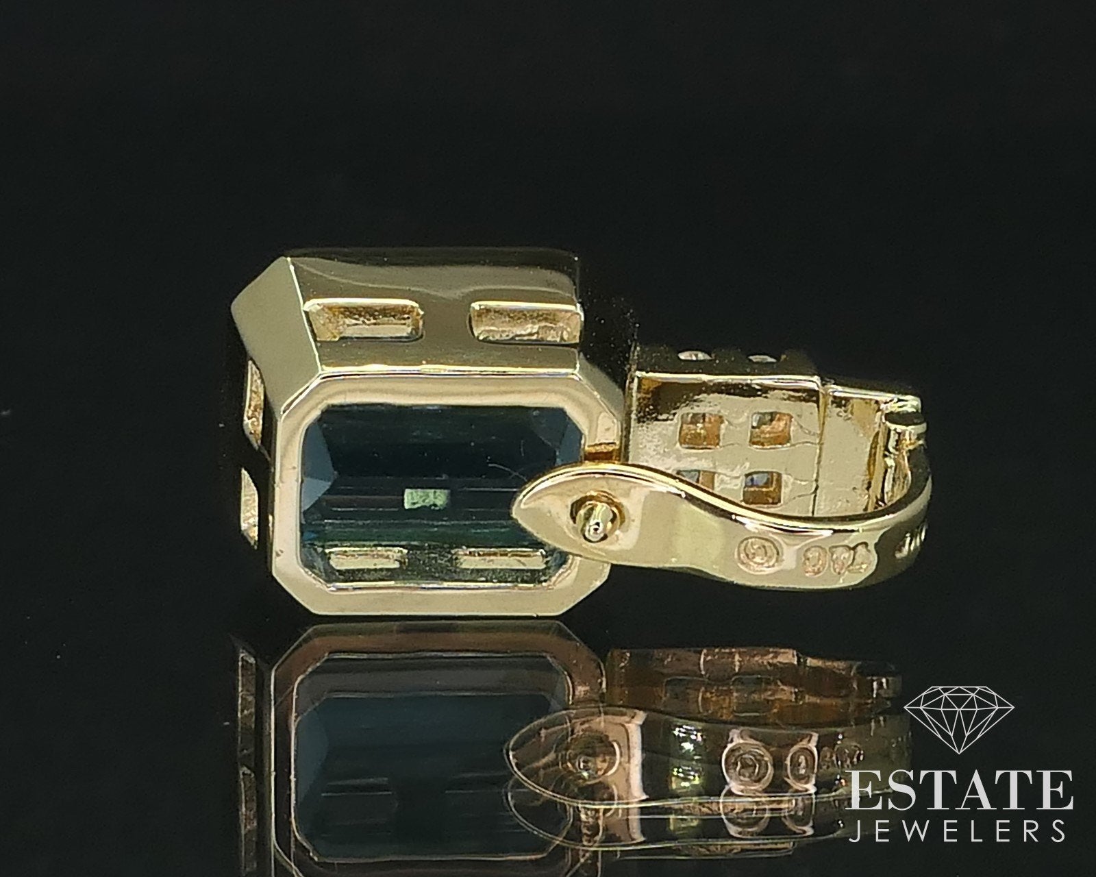 Vibrant ladies enhancer pendant with a emerald cut 9mm by 11mm blue topaz and .09ctw of diamond accents. 13/16"L including bail. stamped 14k