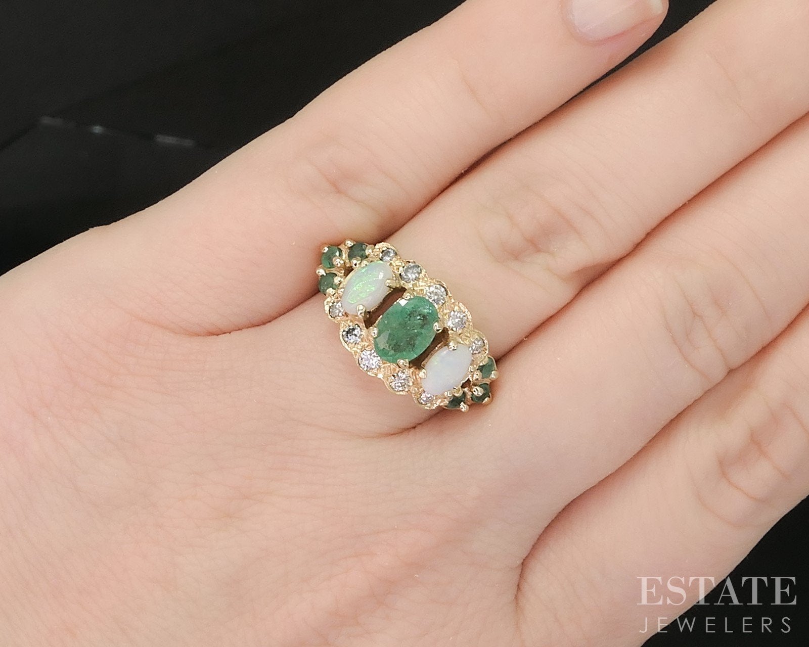 Additional Info: Crafted in glowing yellow gold, this enchanting band features a captivating mix of natural Emeralds and Opals, creating a vibrant interplay of rich green tones and iridescent pastel color. Each gemstone is carefully set to highlight its natural beauty, while sparkling Diamond accents add a touch of brilliance and elegance. Harmonious and eye-catching, this gemstone band blends color, texture, and shimmer into a beautifully balanced design—perfect as a statement piece or a unique addition to any jewelry collection.