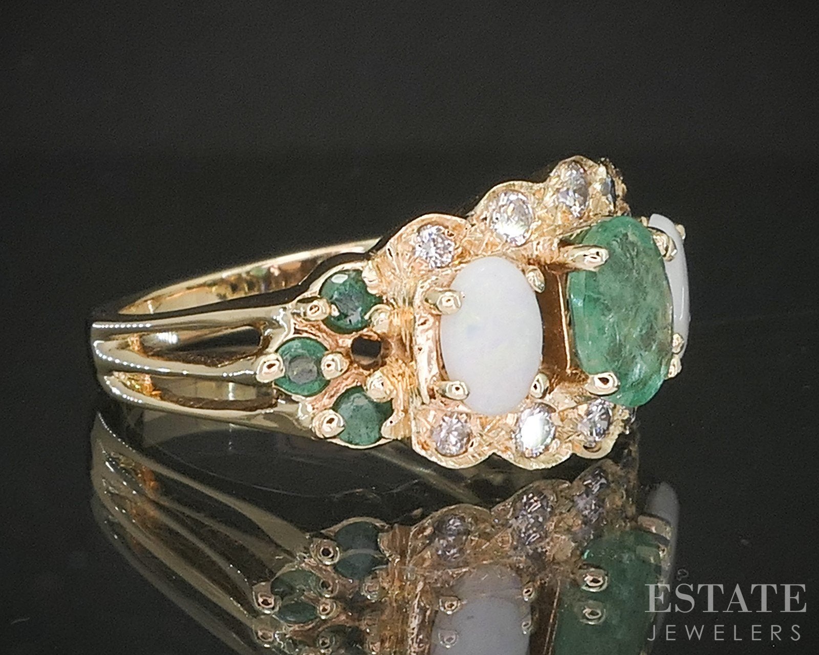 Gemstone Information: Oval (7mm by 5mm) and round (2mm) cut natural Emeralds as well as oval cut Opals (6mm by 4mm)