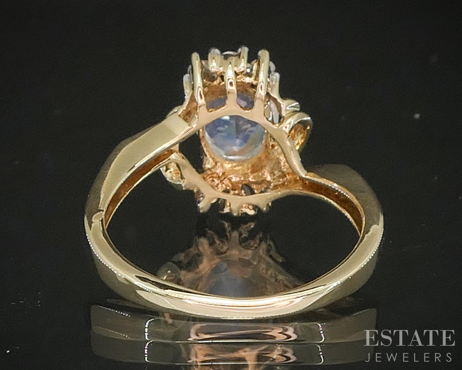 Additional Info: Beautiful ladies bypass ring a unique and colorful faceted Moonstone accented by sparkling Diamonds above and below.