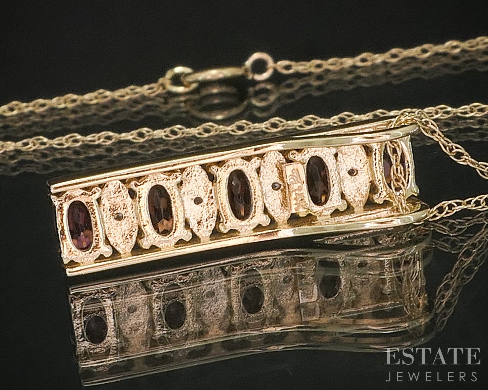 Additional Info: Radiating soft sophistication, this enchanting necklace features a row of vivid Pink Tourmaline in an elegant bar shaped pendant. The vibrant gemstones are alternating round-cut Diamonds, adding brilliance and depth to the romantic hue of the Tourmaline. Suspended from a delicate yellow gold chain, the pendant captures light beautifully, creating a timeless piece that’s both feminine and refined. Whether worn as a symbol of love or a statement of style, this necklace brings a touch of warmth and elegance to any ensemble.